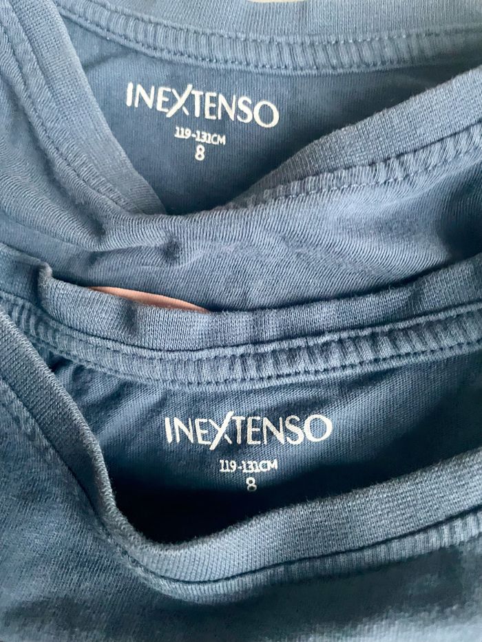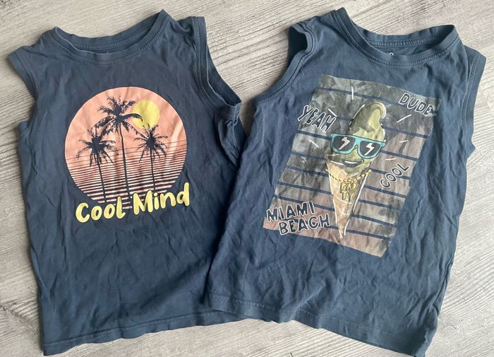Lot de deux débardeurs / tee shirt sans manches de la marque In Extenso Taille 8 ans Présence d’un accroc recousu au dos du débardeur avec le motif « cool mind » (voir photo) Occasion, bon état général