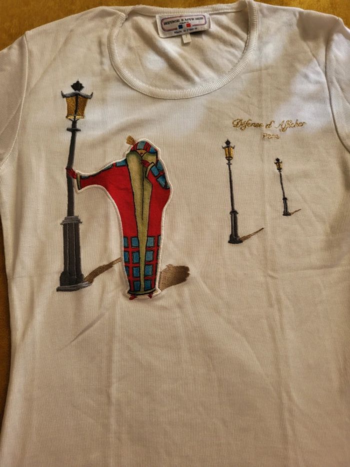 #haut #Tee-shirt #femme #défensedafficher #Paris #viscose et #coton #blanc avec #broderie illustrée #femme élégante à Paris Véritable #vintage des années 80' #taille38 en parfait état #tailleMmelodyriri31 #vintagemelodyriri31