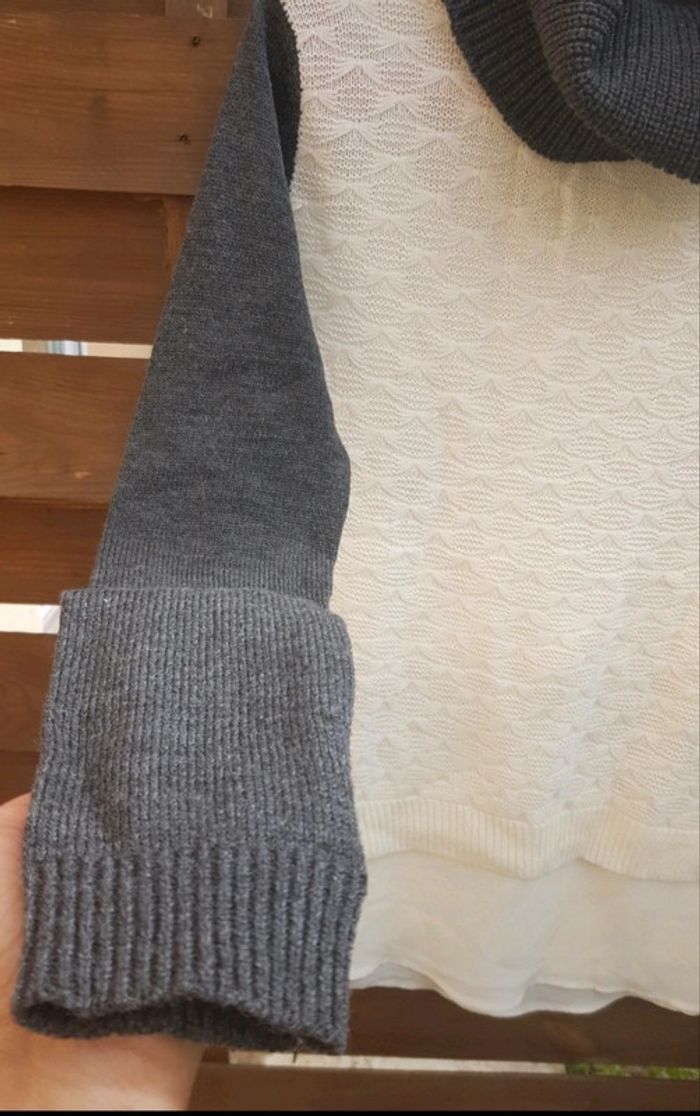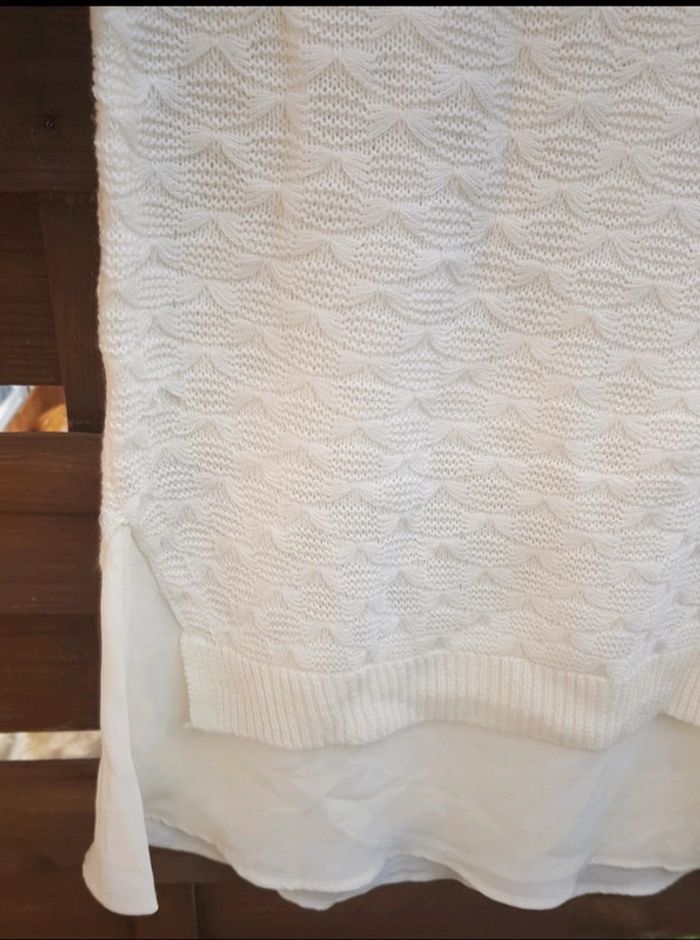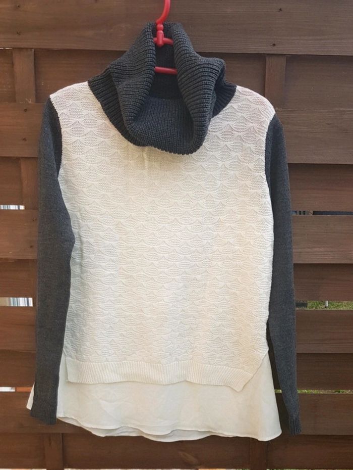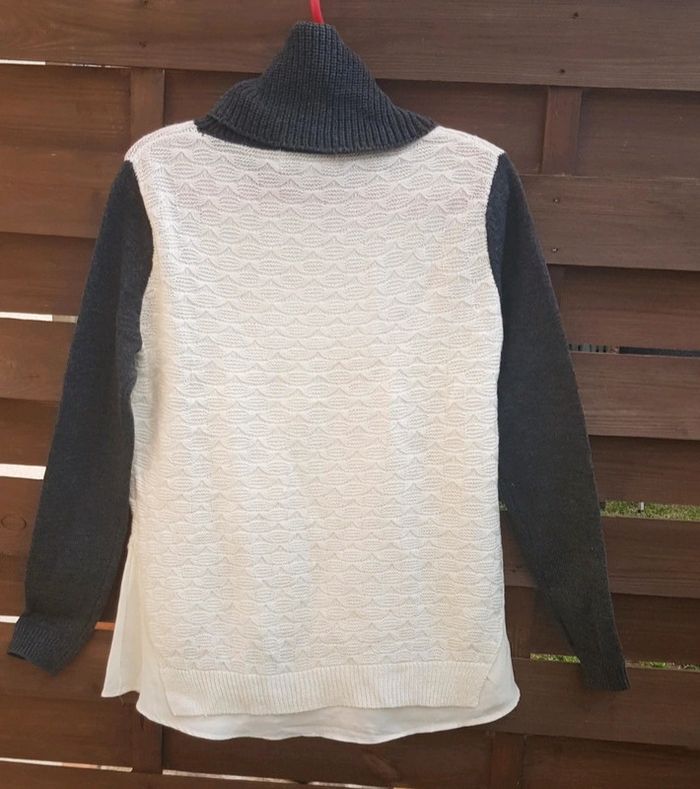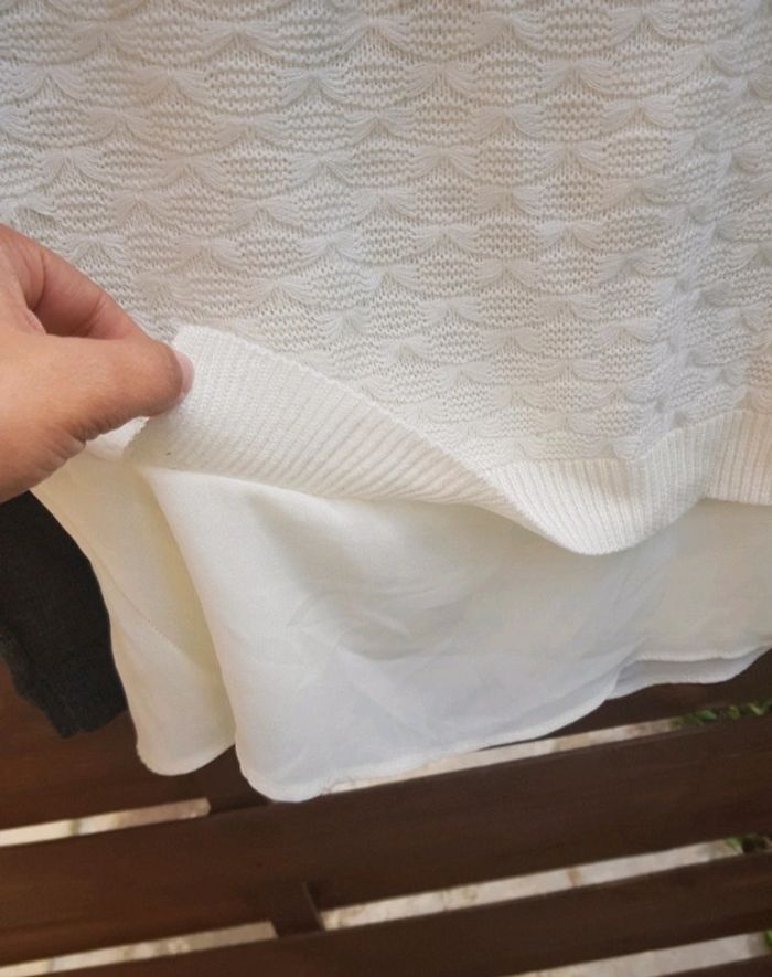 Le pull est 100% acrylique (doux et agréable à porter) et la partie chemisier en bas en polyester