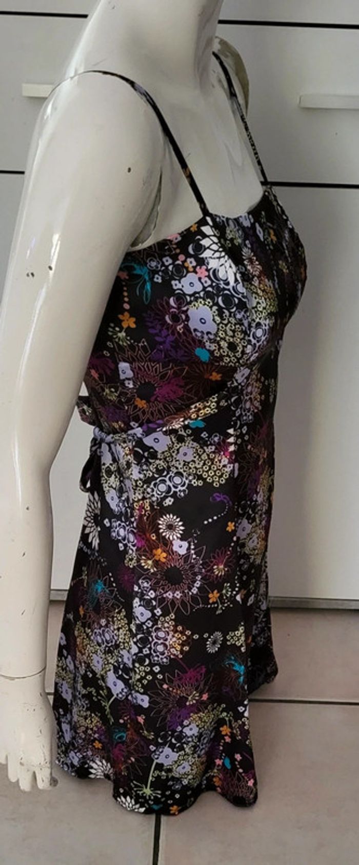 #robe #femme style #nuisette Noir à imprimé #floral Tissu #satiné légèrement #extensible #finesbretelles #réglables #tailleS (étiquette taille et composition coupée) en #tresbonetat Véritable #vintage de la marque #pourquoipas #tailleSmelodyriri31 #vintagemelodyriri31