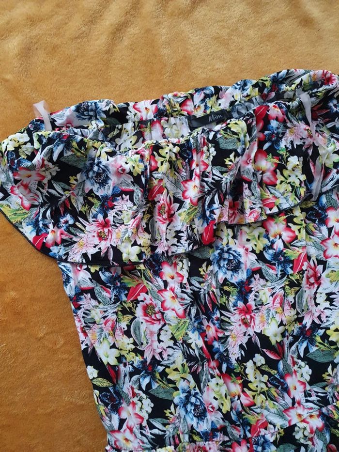 #combinaison #femme #fleurie #bustier #volantée en haut Élastique à la taille et au niveau du buste (ça tombe pas) Poches sur les côtés Légère et agréable à porter (je pense qu'il s'agit du coton ou viscose) Étiquette taille et composition coupé