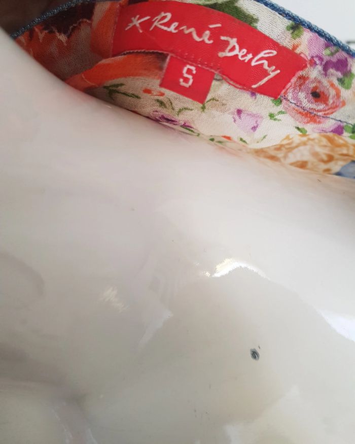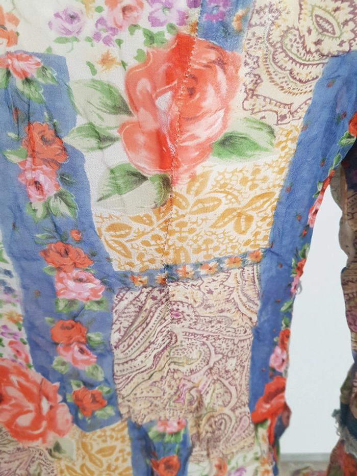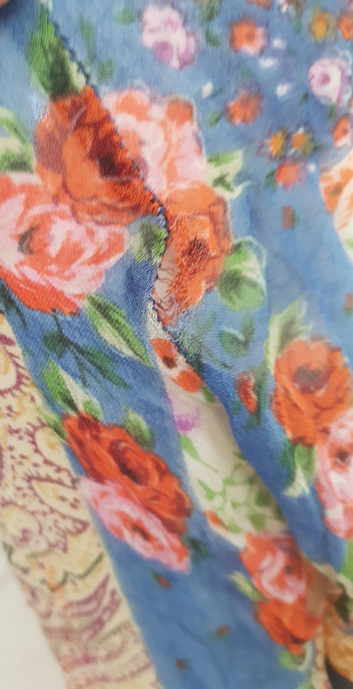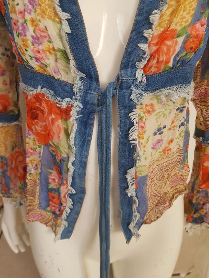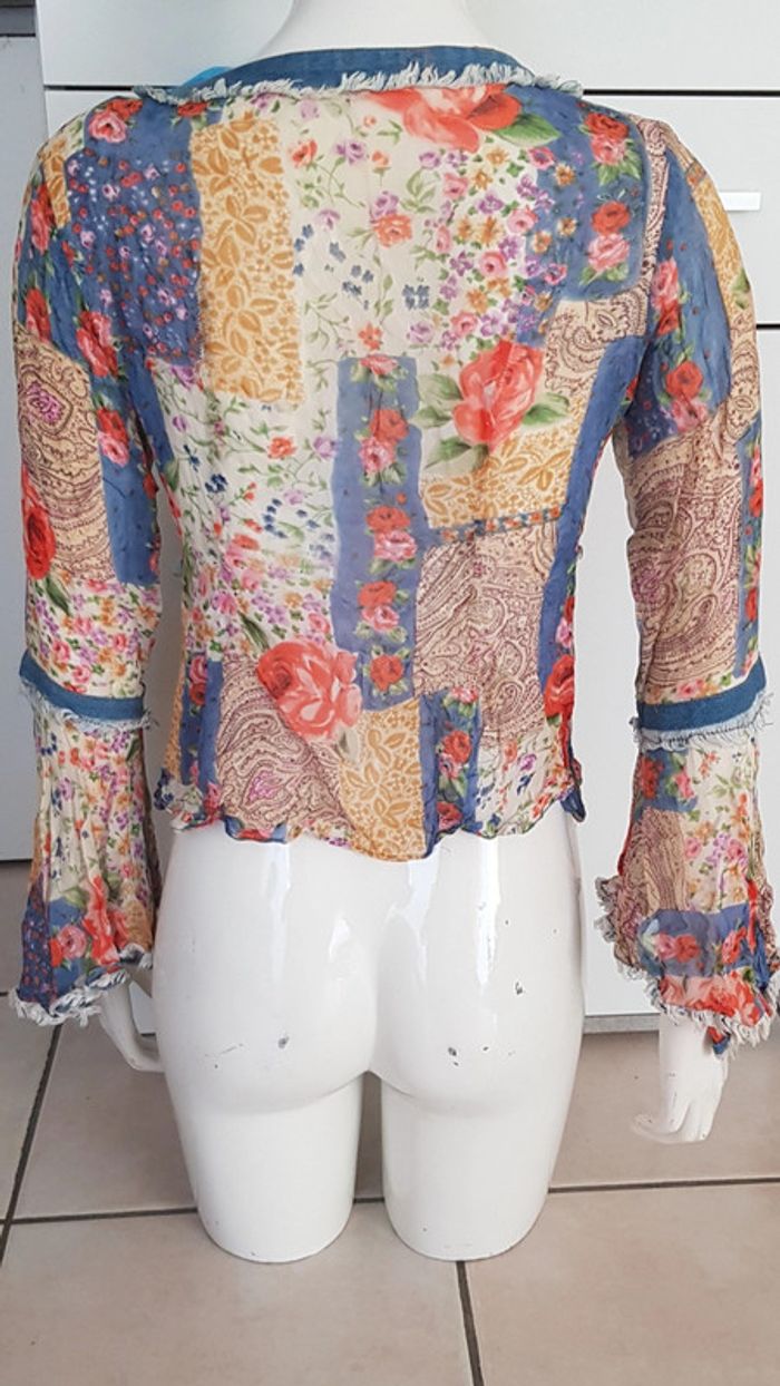 #chemise #blouse #bimatiere #jean effet #déchiré et #tissu #voile #fleurie #transparent avec manches volantées Fermeture avec lien devant à #nouer Véritable #vintage de chez #renéderhy Défauts: voir les 4 dernières photos! #tailleS #vintagemelodyriri31 #tailleSmelodyriri31