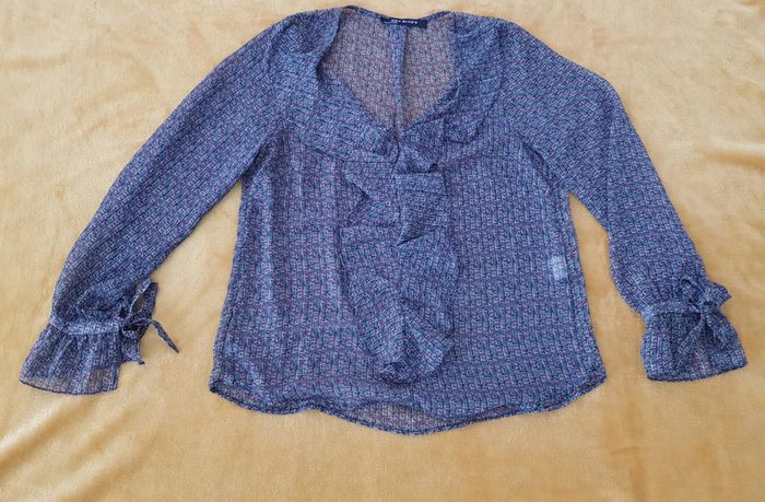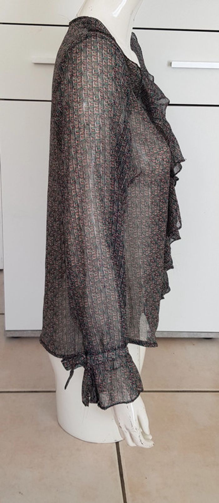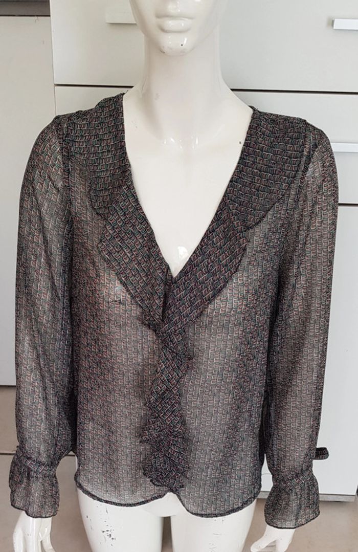 #blouse #femme #transparente à #volant devant et aux niveaux des manches Lien à nouer au niveaux des manches Finition fil #argenté #brillant #colV Véritable #vintage de la marque #emablues #fabricationfrancaise 🇨🇵🇨🇵 #taille38 (taille2) mannequin taille34/36 pour avoir une idée Couleur comme sur la dernière photo! En #tresbonetat (légers imperfections mais rien de bien méchant!) #tailleMmelodyriri31 #vintagemelodyriri31