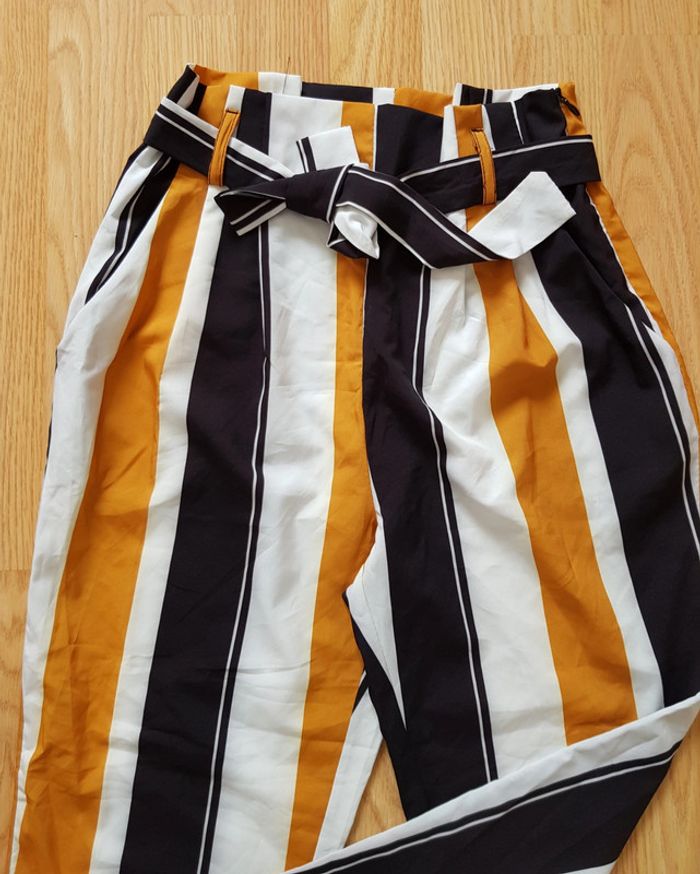 Pantalon rayé taille haute froncée ceinturée - photo numéro 2
