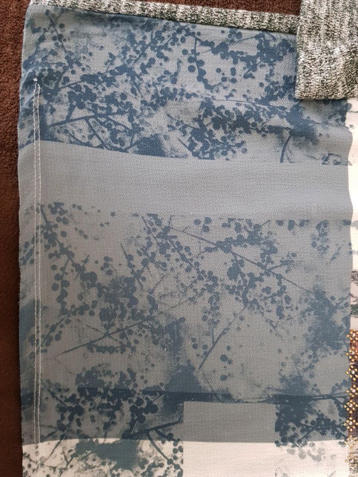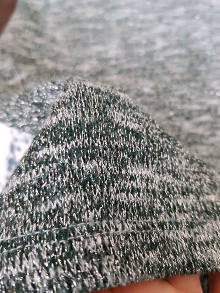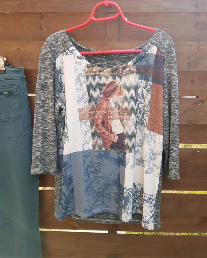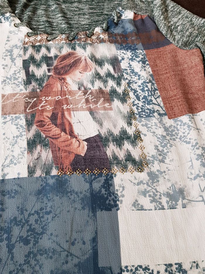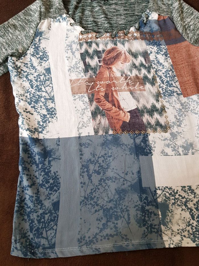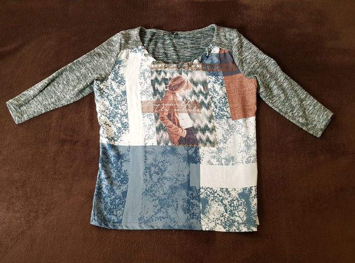 Très joli haut #chic #décontracté #teeshirt #femme avec imprimé photo devant Manches 3/4 Détail fils argentés #taille3 (#tailleL) En #tresbonetat (léger défaut visible dernière photo)