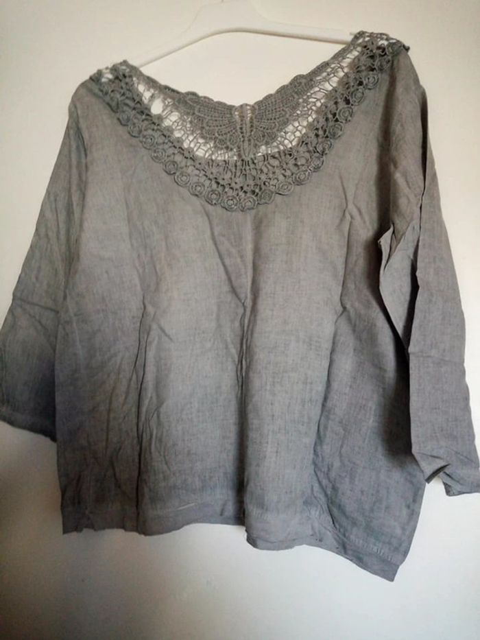 très joli haut avec dentelle dans le dos manche 3/4que l'on peut remonté et tenir avec boutons voir les photos. Matière légère #vétementsfemmetailleunique