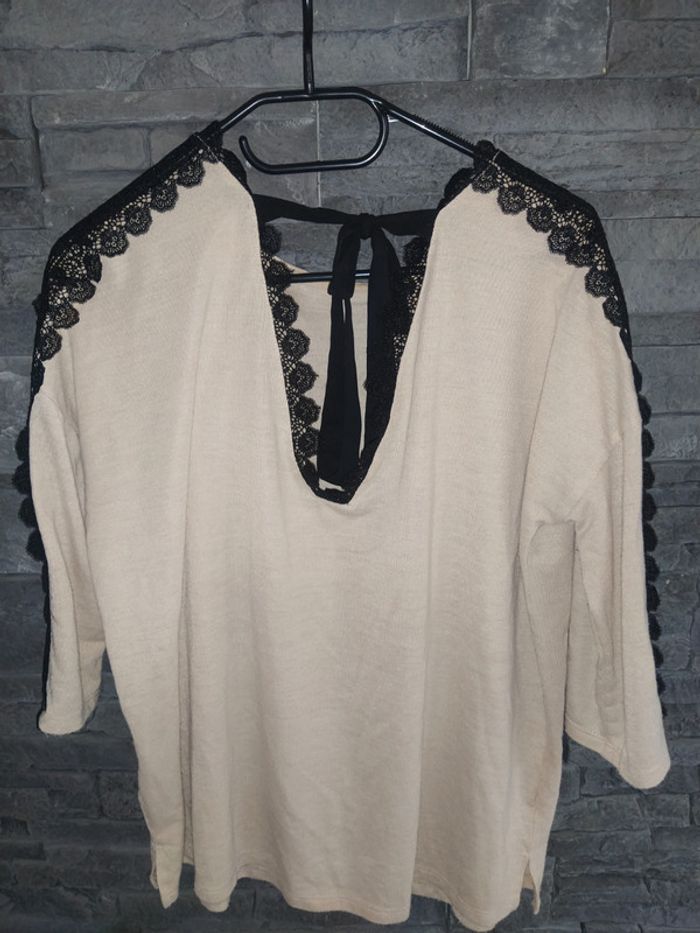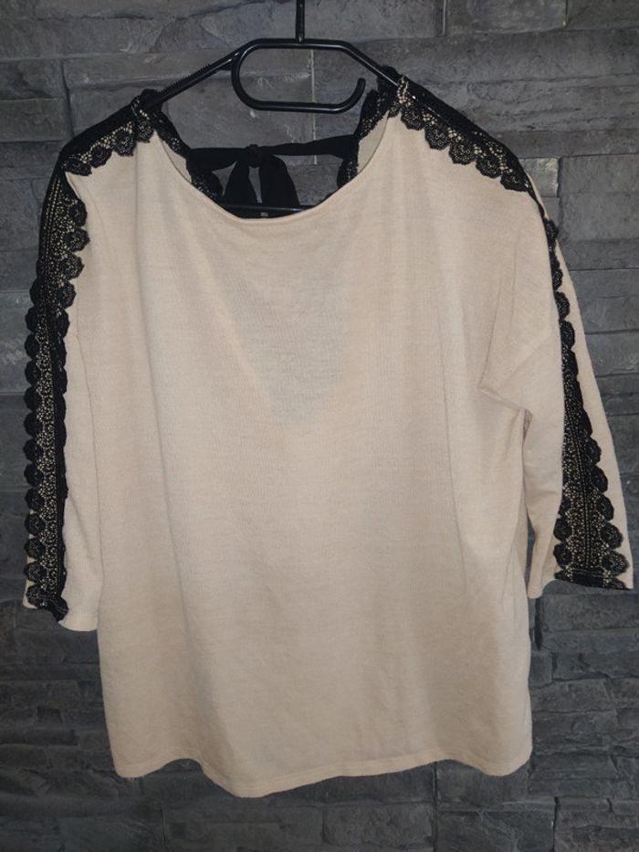 A vendre t-shirt Kiabi beige avec motif de dentelle noir Taille M