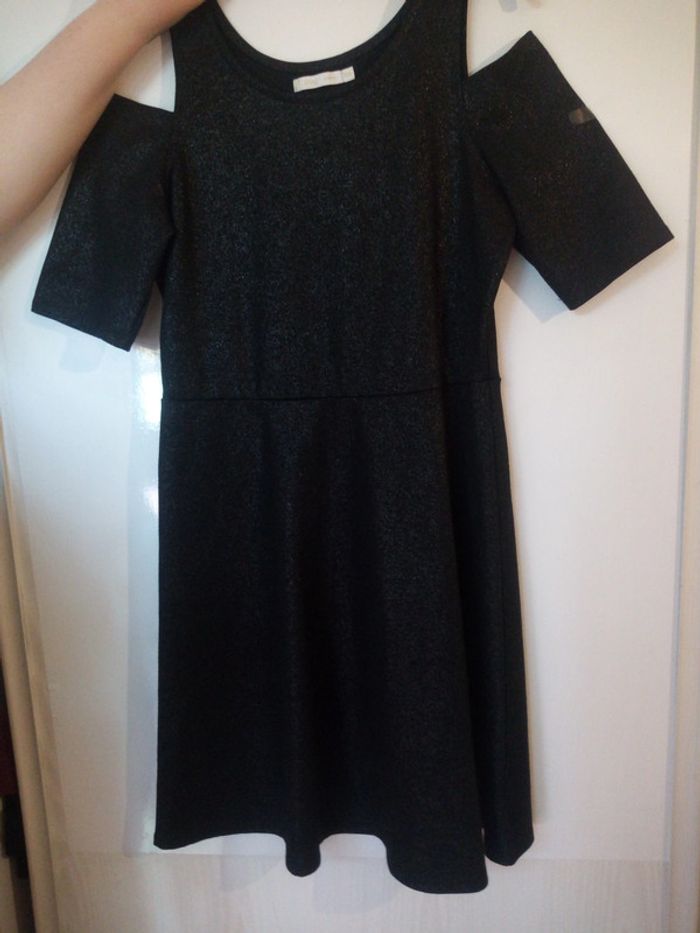 Robe noire légèrement pailletée aux épaules dénudées. Taille : 16 ans
