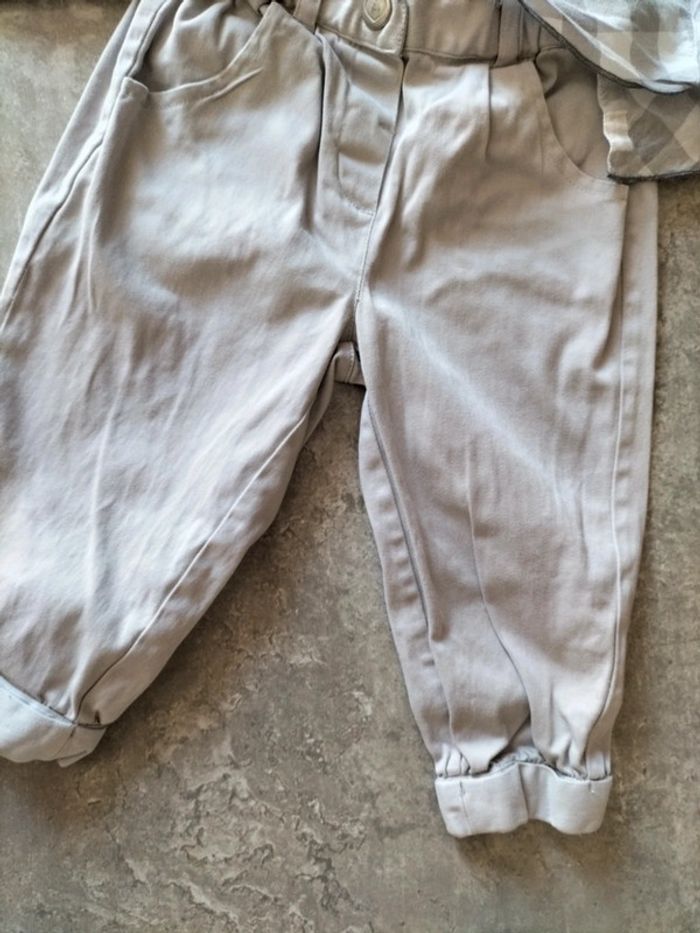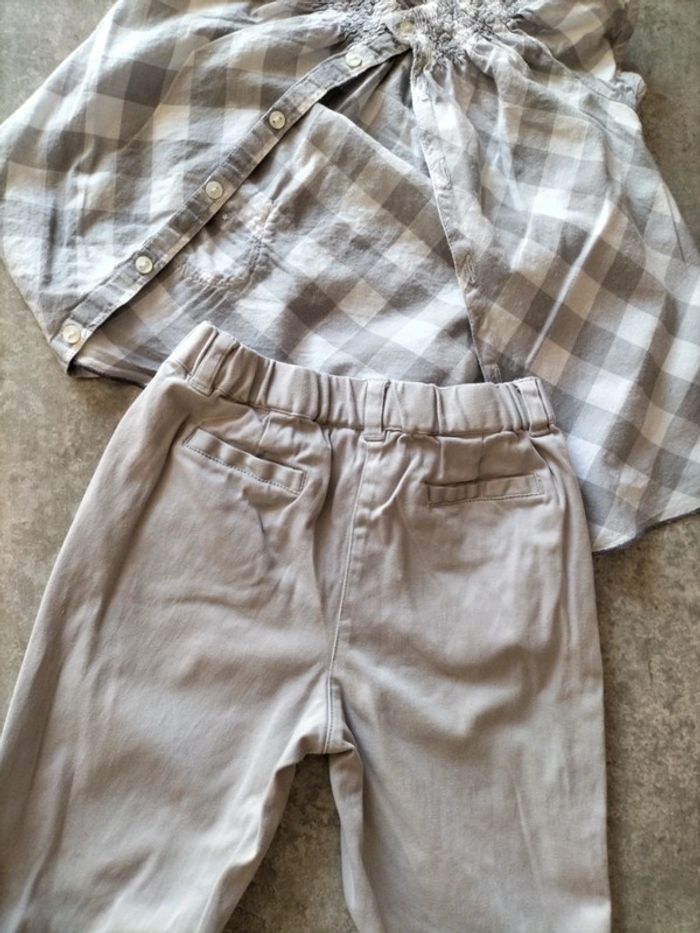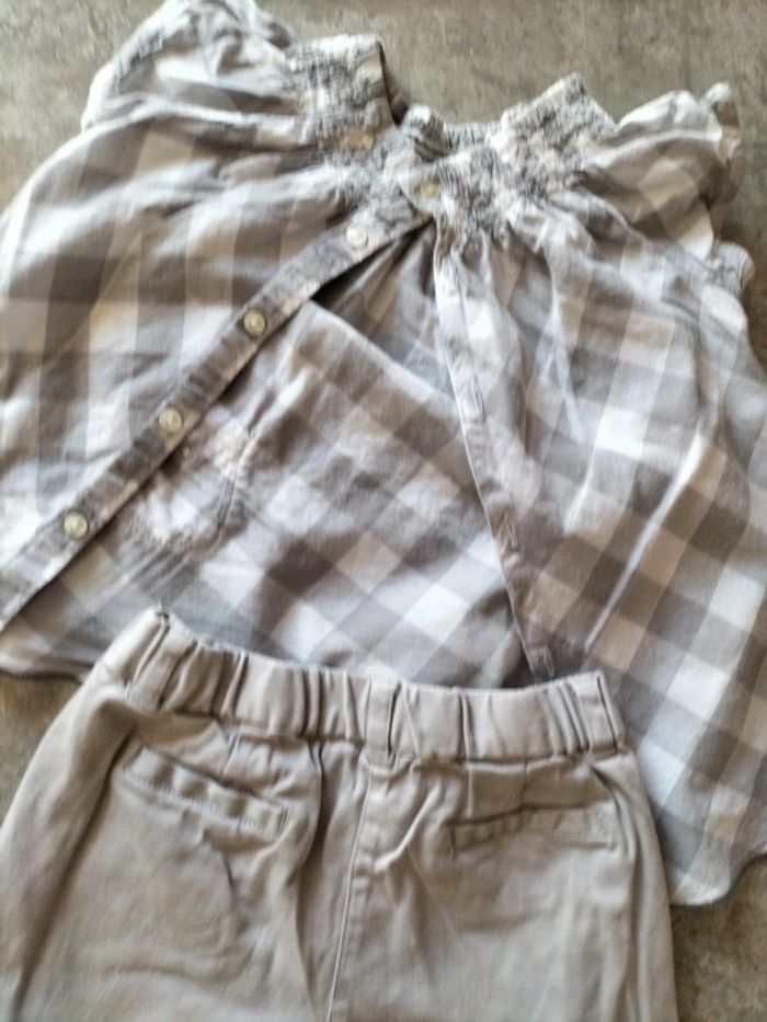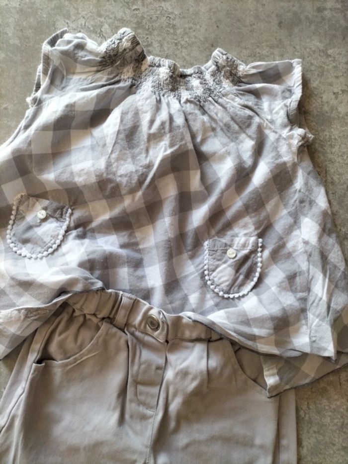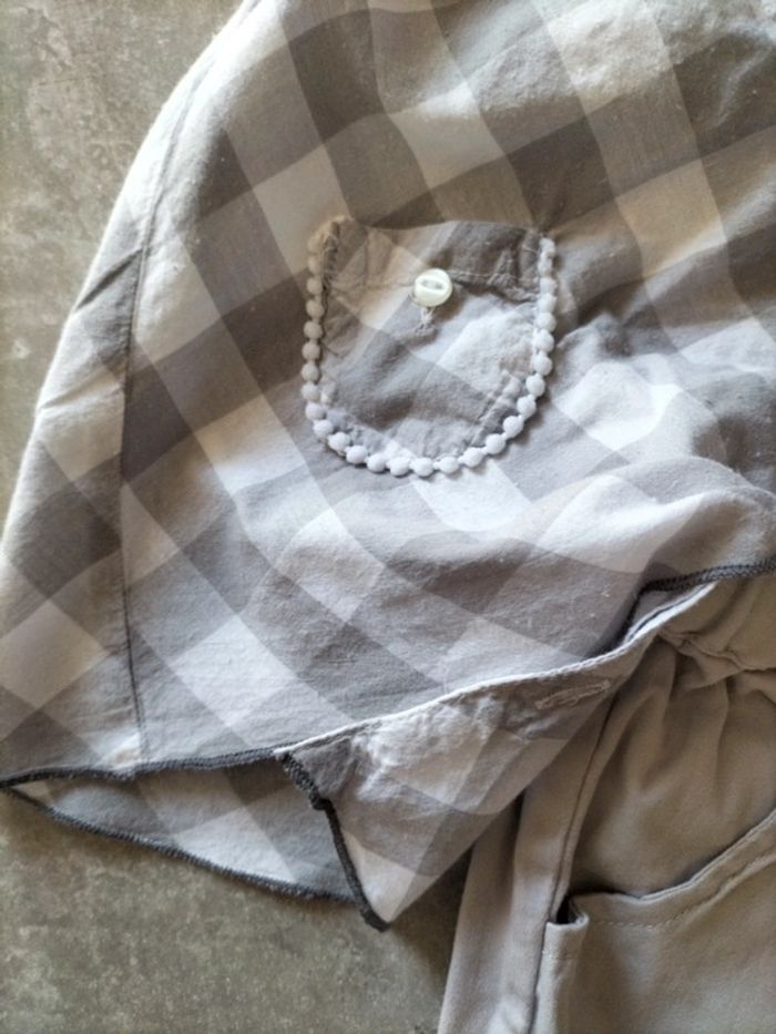 Ensemble pantalon gris coton et élasthane resserré dans le bas par un revers Blouse a carreaux coton smocks a l' encolure. Boutonnage à l' arrière #fanfanfille18 mois@fanfan35320