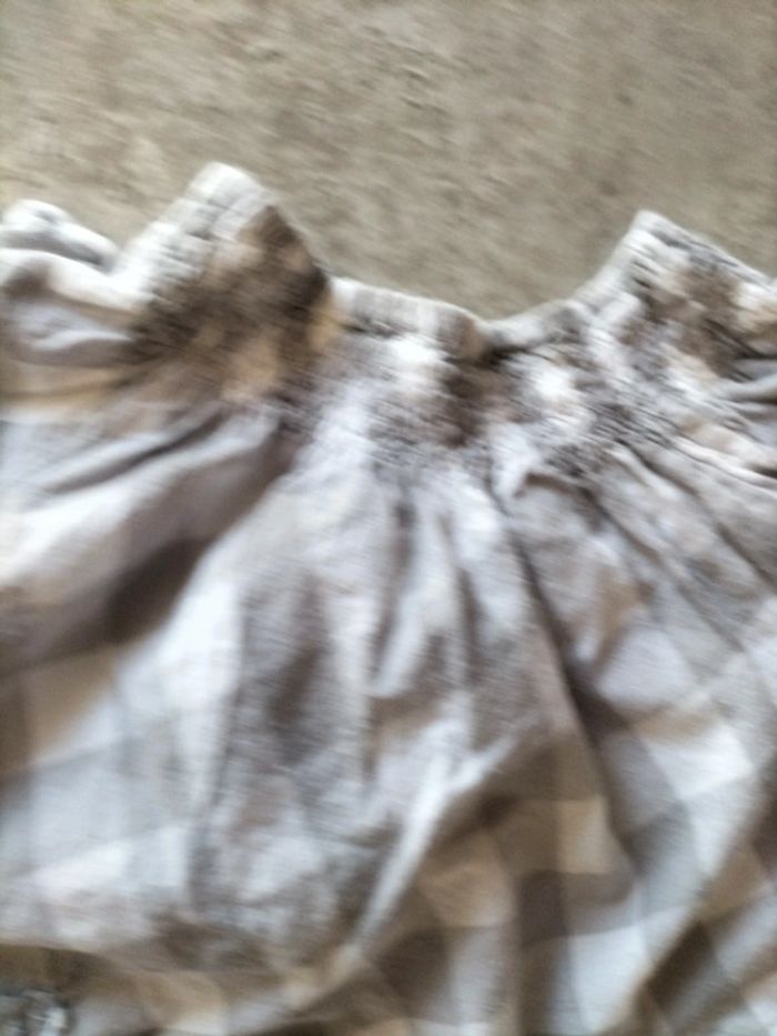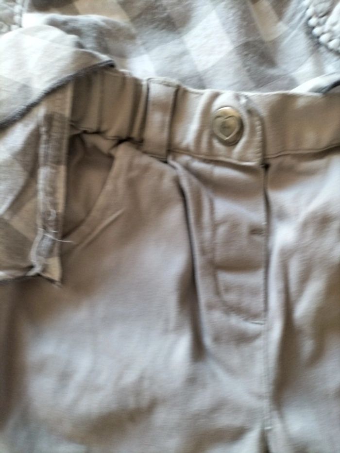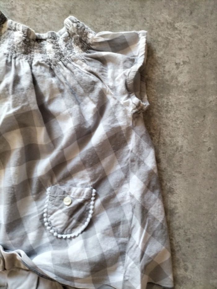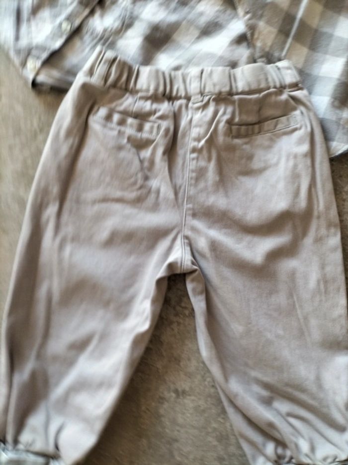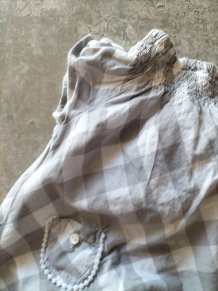 Ensemble pantalon gris coton et élasthane resserré dans le bas par un revers Blouse a carreaux coton smocks a l' encolure. Boutonnage à l' arrière #fanfanfille18 mois@fanfan35320