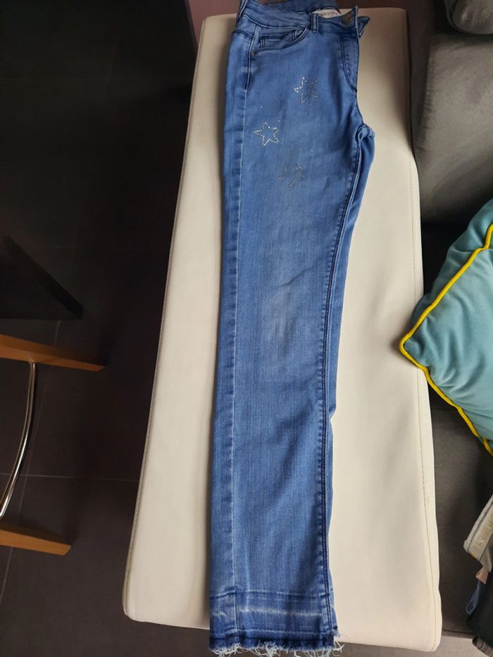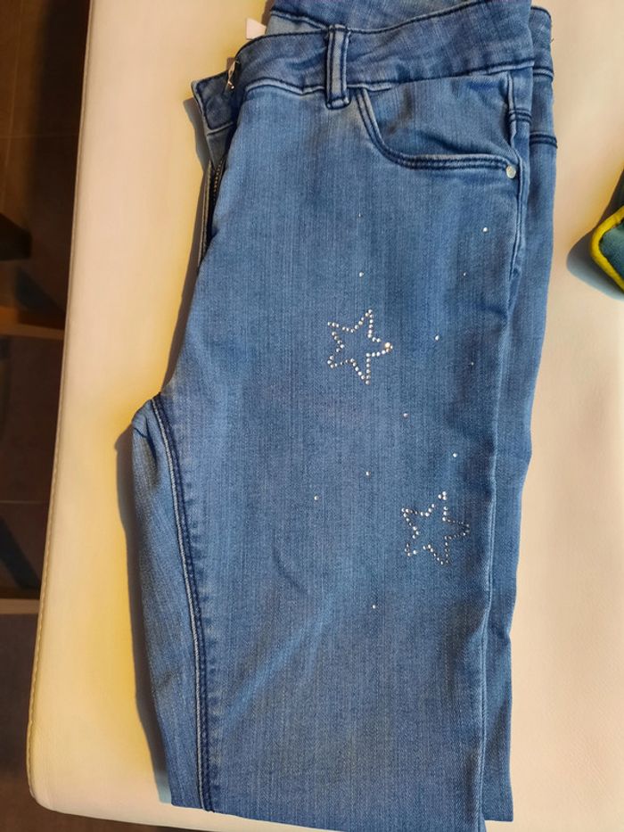 A vendre jeans motifs avec étoiles brillantes de chez orchestra porté 2 fois en excellent état. Taille 10 ans. Maison non-fumeur et sans animaux.