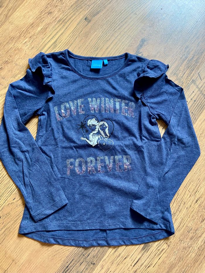 Teeshirt à manches longues. En très bon état. Il possède des petits froufrous au niveau des épaules. Et un motif reine des neiges.