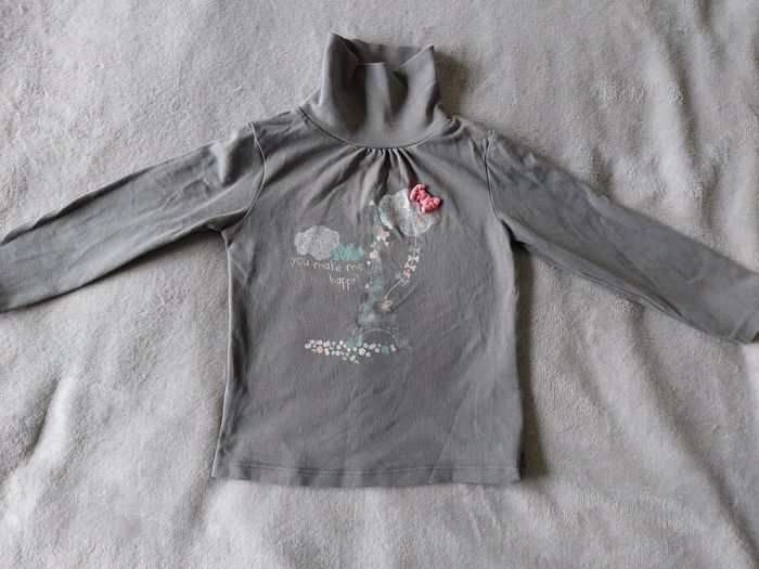 Sous-pull col roulé de la marque Vertbaudet. Bon état. La tour Eiffel est un peu effacée. Taille 2 ans. Composition = 95% coton, 5% élasthanne. Fabriqué au Bangladesh. N'hésitez pas à me contacter si vous avez des questions. Je vous répondrai dès que possible.