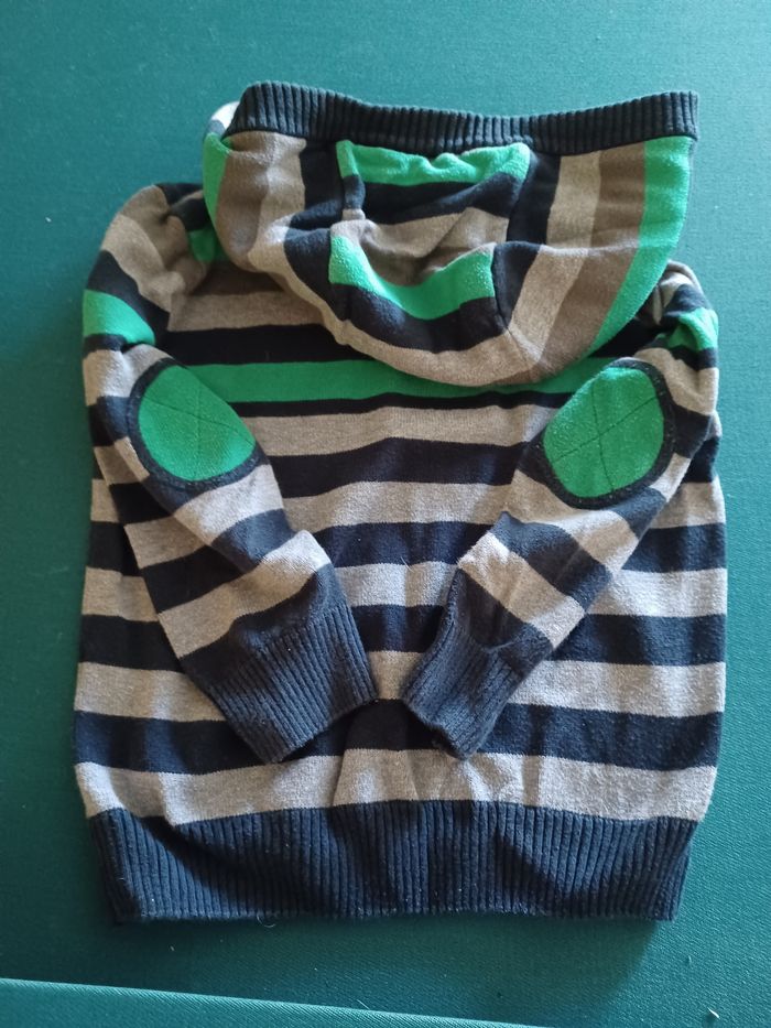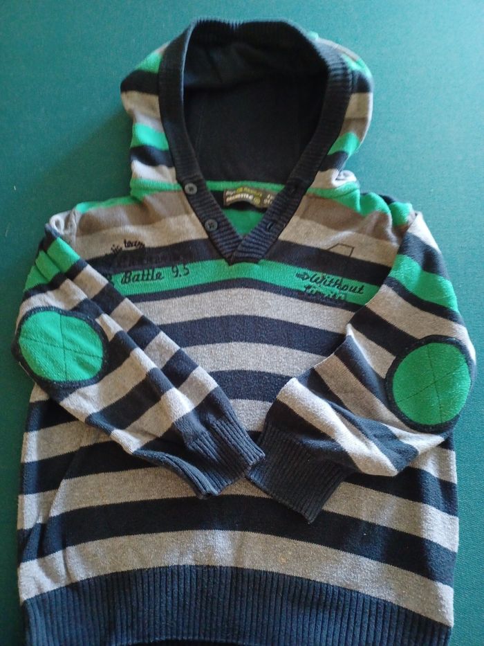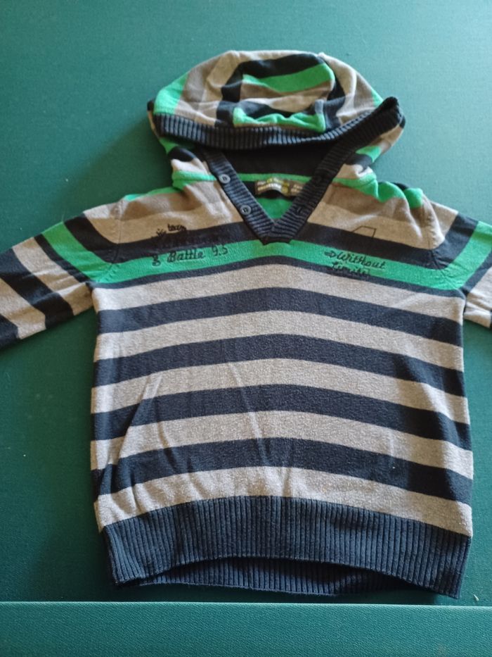 Jolie pull rayé gris vert bleu avec capuche 4 ans orchestra