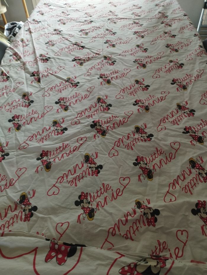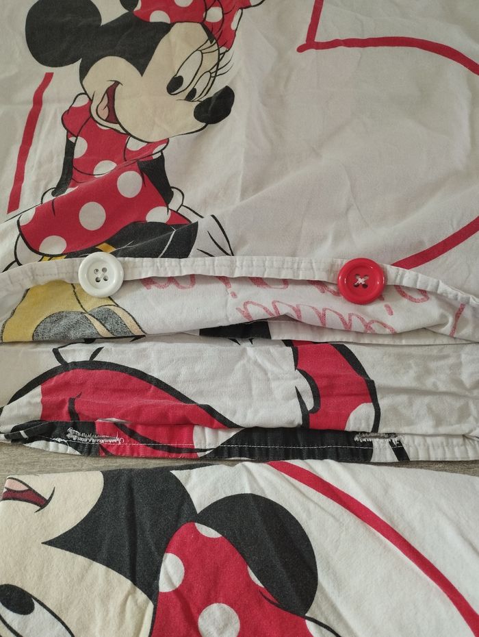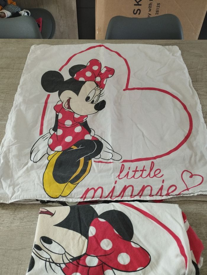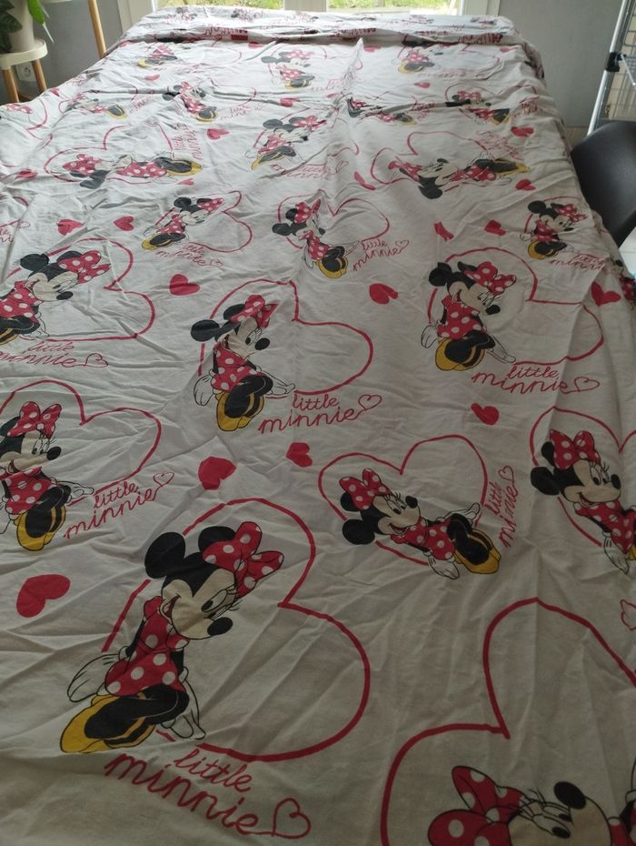 Housse de couette réversible avec rabats. Avec 2 taies d oreiller identiques réversible Minnie Disney fermeture par boutons Bon état . Ni trous ni tâches Propre mais non repassé