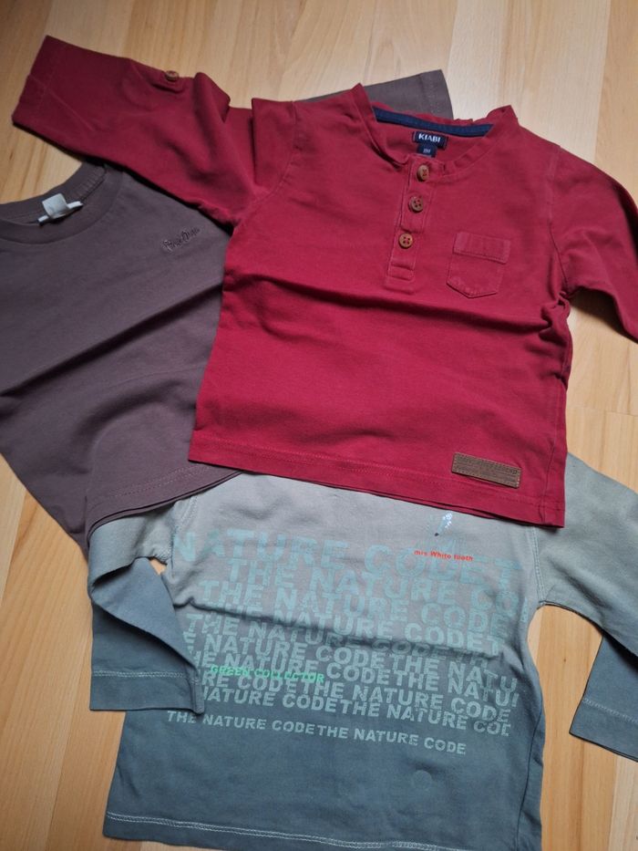 GARÇON 18 MOIS N°676 lot de 3 maillots Longues manche - grena , 100% coton Kiabi - Vert 2 tons , 100% coton Pression dos Kitchoun - marron 100% coton Pression épaule Pickouic Taille 18 mois 2,50€ #kelly_garçon18mois