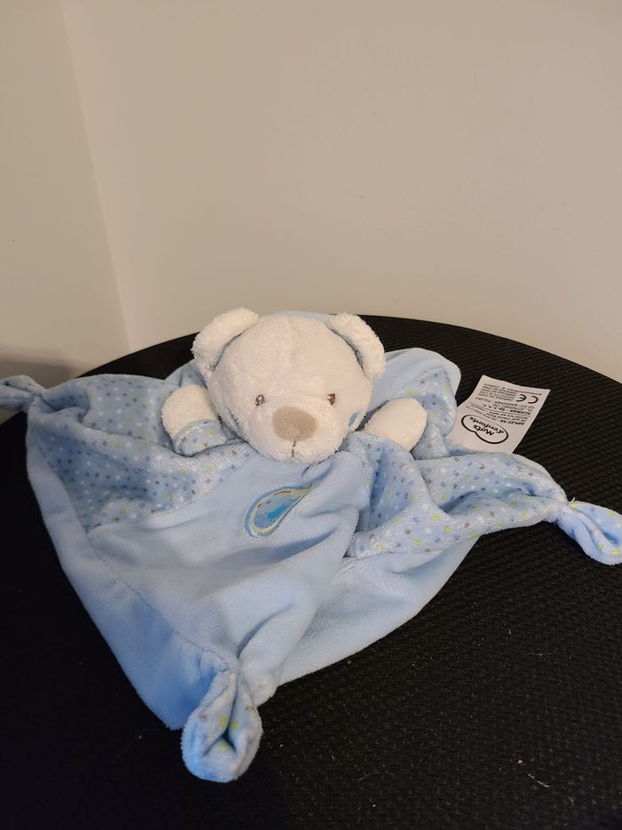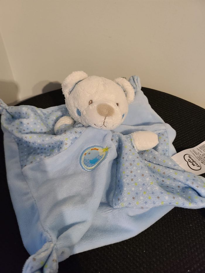 DOUDOU PLAT OURS MOTS D'ENFANTS BLEU ÉCUSSON OISEAU POULE 4 NOEUDS 114
