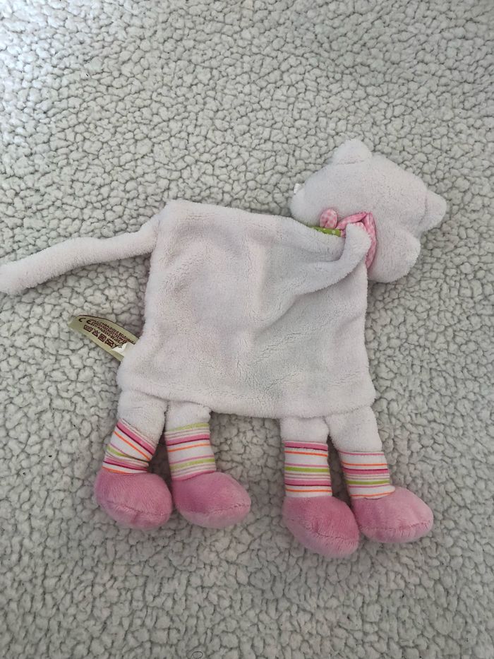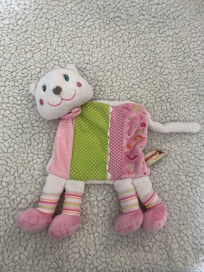 Doudou plat chat rose vert blanc 4 pattes +/- 26cm Nicotoy Occasion en très bon état Vous achetez le doudou que vous voyez sur la photo