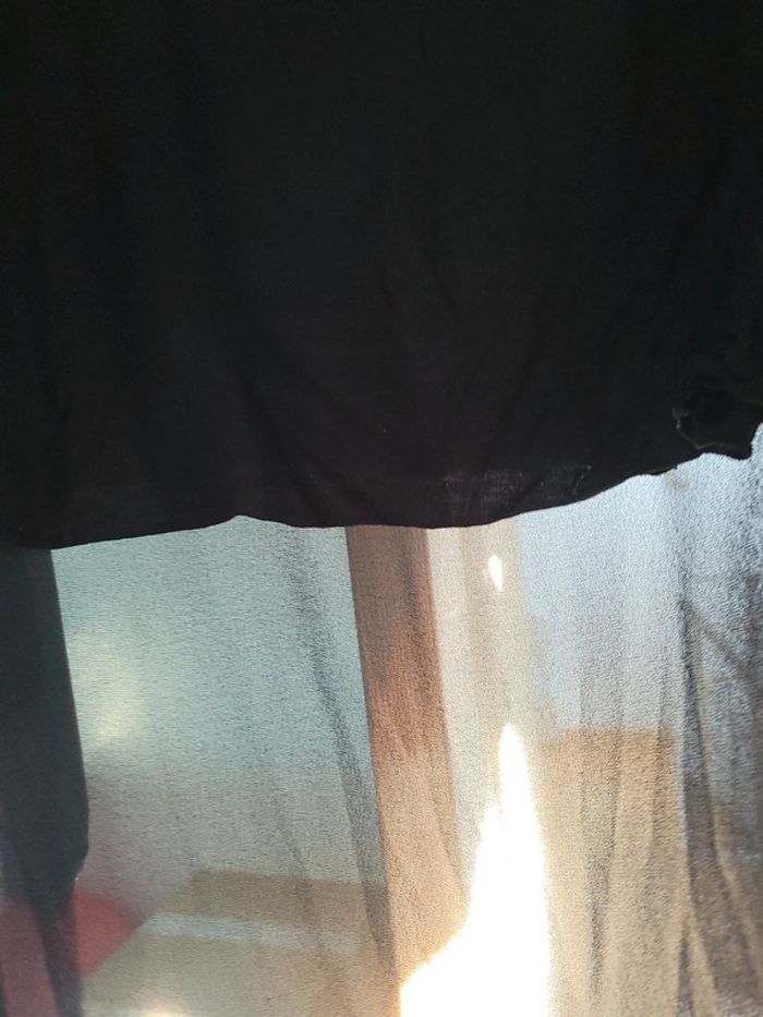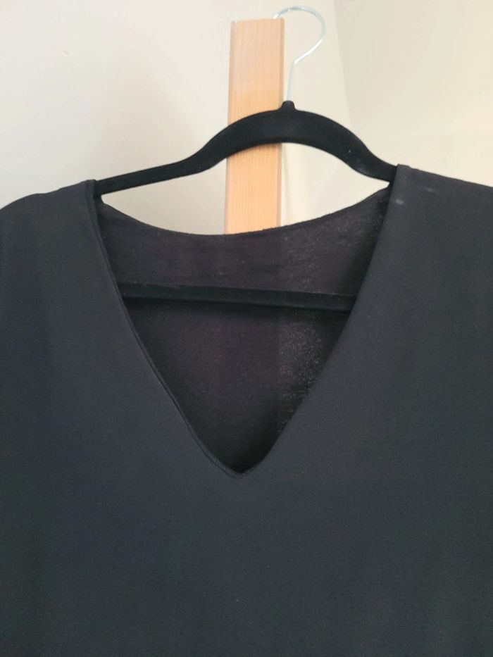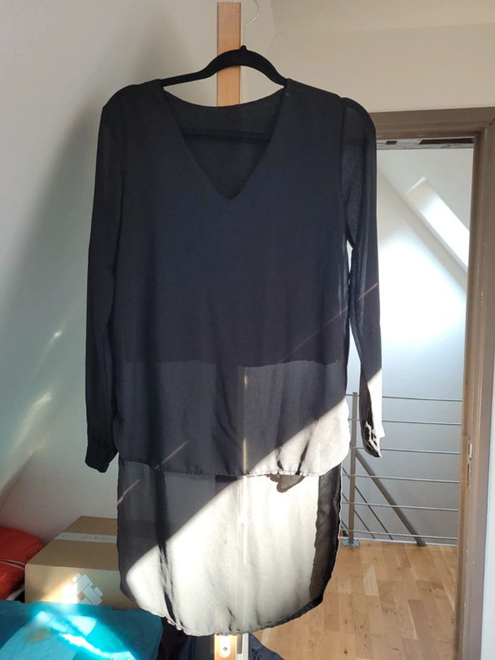 Blouse fluide avec jeu de transparence Entièrement doublée en haut, elle n'est transparente que sur le bas Plus longue derrière (arrive sous les fesses) que devant Manches longues qui se ferment avec un bouton
