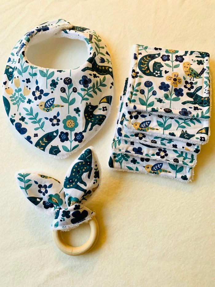 Coffret trio Bambinous Thème Forêt Enchanté 🌸 - 1 Bavoir double face Tissus Foret Enchanté et Tissu éponge de bambou extra doux sans irritant pour la bouche de bébé. - 1 Hochet lapin avec anneau de dentition spécialement conçu pour soulager les poussées dentaires. Anneau non traité non vernis. - 5 Lingettes lavable en tissu éponge de bambou. Tissus oéko-tex Large choix de modèles, pour plus d’informations me contacter en message privé belle journée 🧸🎀 Peut être vendu séparément
