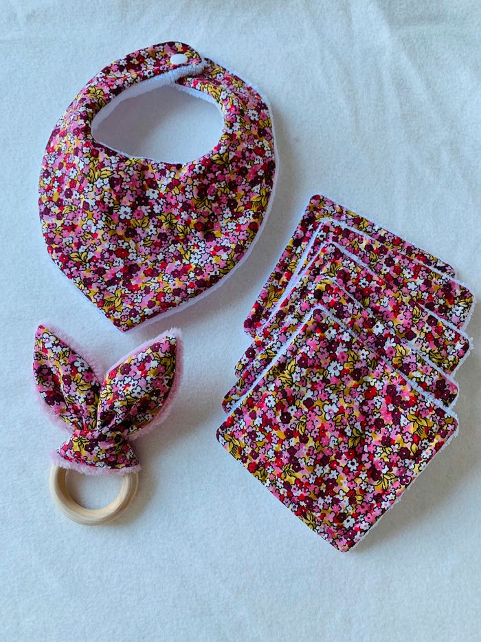 Coffret trio Bambinous Thème Printanière 🌸 - 1 Bavoir double face Tissus Printanière et Tissu éponge de bambou extra doux sans irritant pour la bouche de bébé. - 1 Hochet lapin avec anneau de dentition spécialement conçu pour soulager les poussées dentaires. Anneau non traité non vernis. - 5 Lingettes lavable en tissu éponge de bambou. Tissus oéko-tex Large choix de modèles, pour plus d’informations me contacter en message privé belle journée 🧸🎀 Peut être vendu séparément