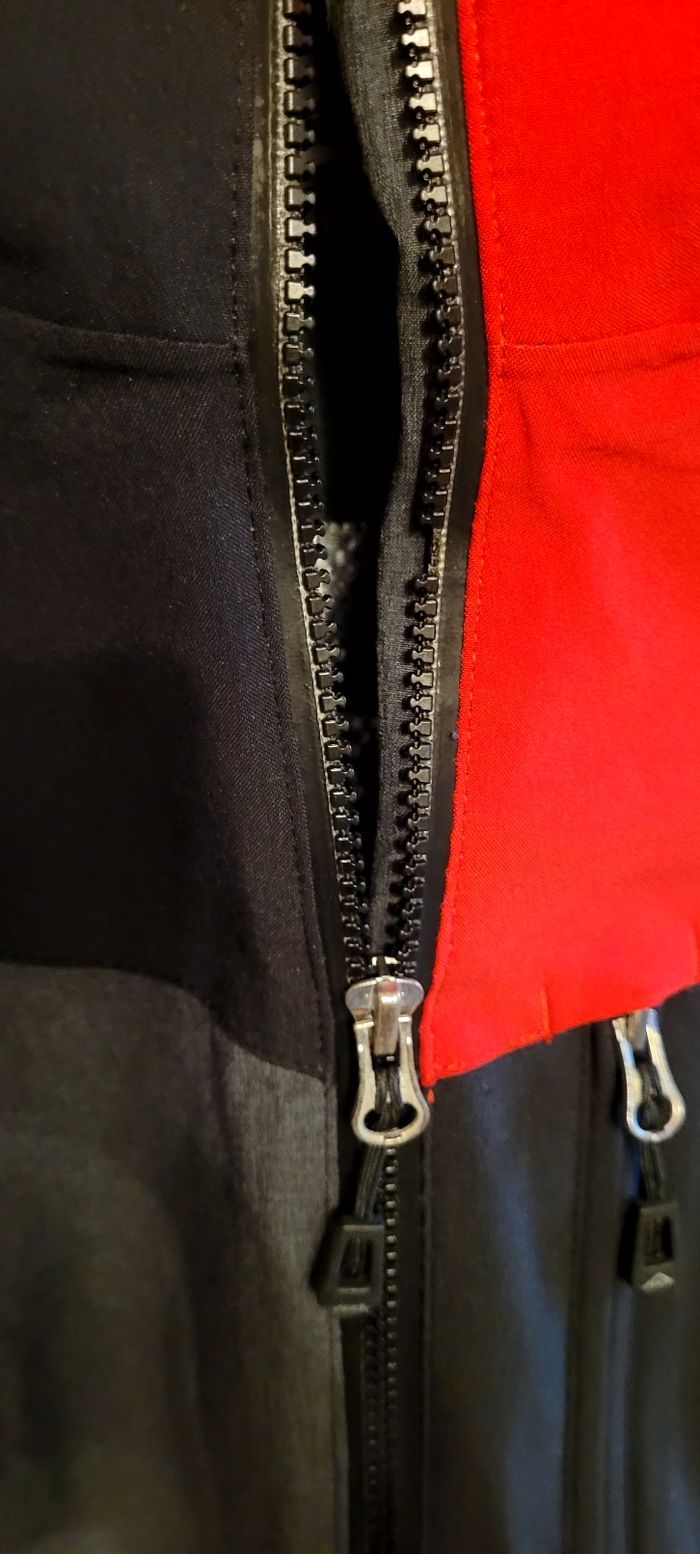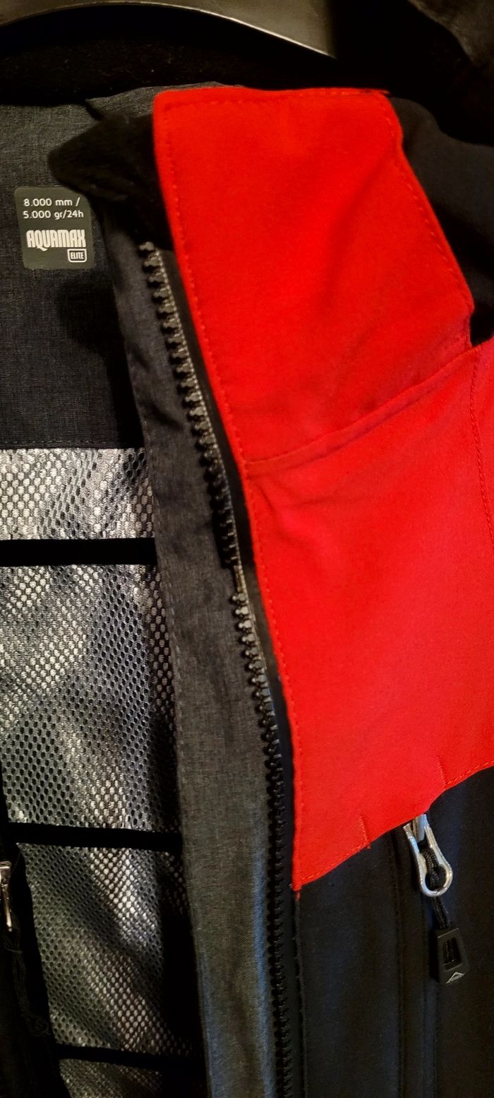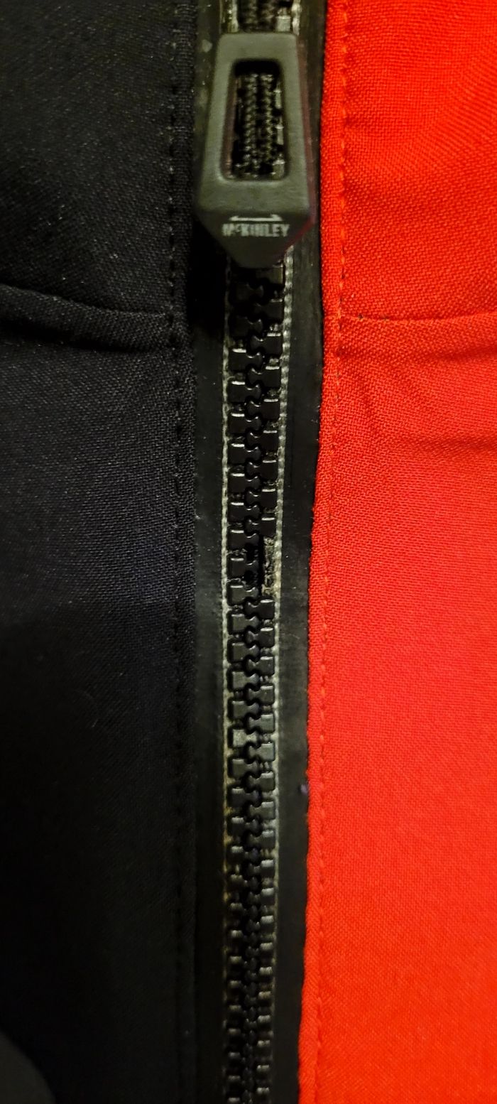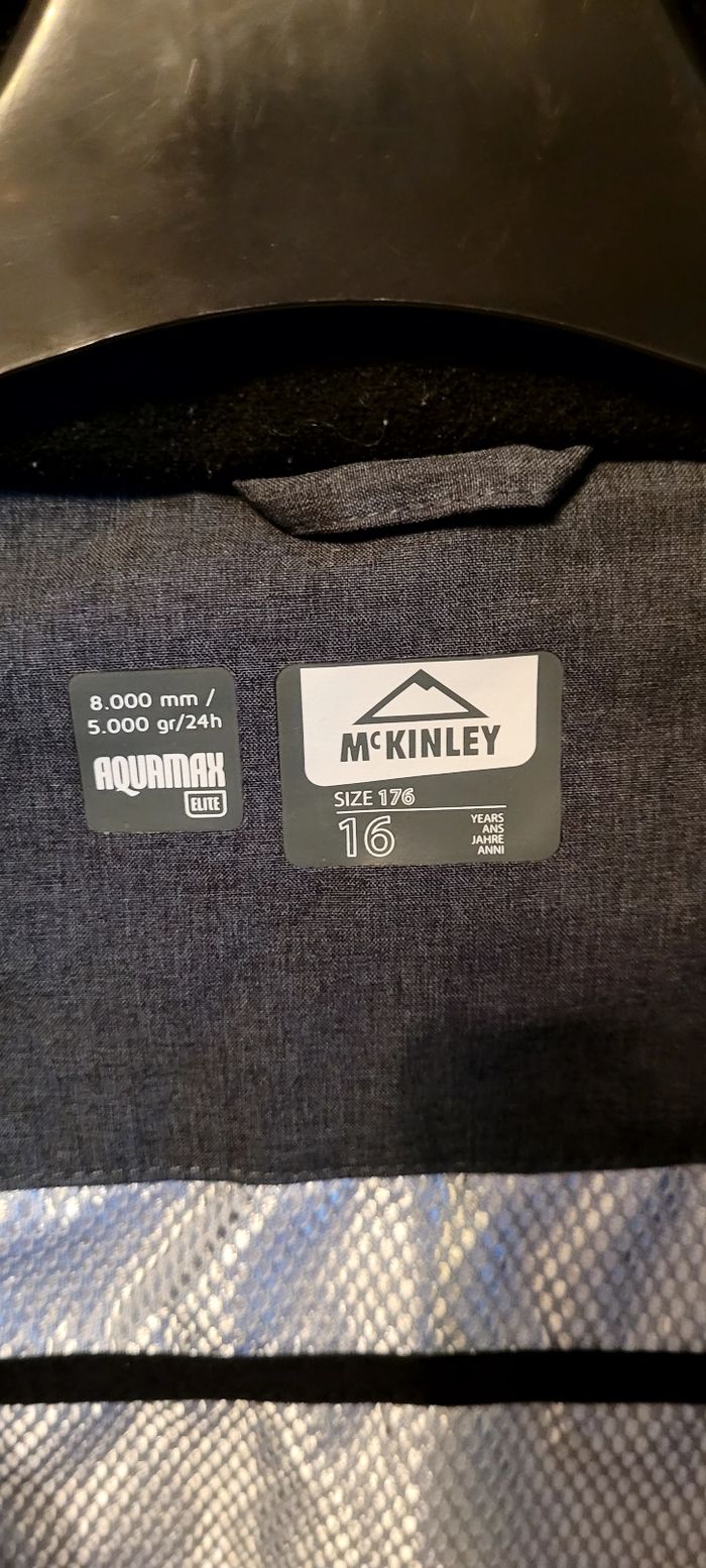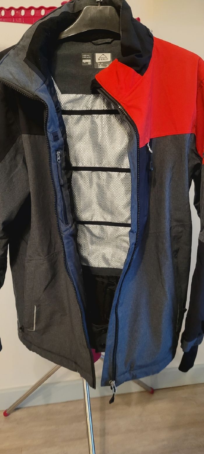 Veste de ski McKinley, sans capuche. Membrane imper-respirante AquaMax (8000 mm / 5000 gr/24h) Comporte de nombreuses poches. Il manque 3 dents à la fermeture éclair (photo 6) mais cela ne gêne en rien l'ouverture ni la fermeture de la veste (photos 7 et 8).