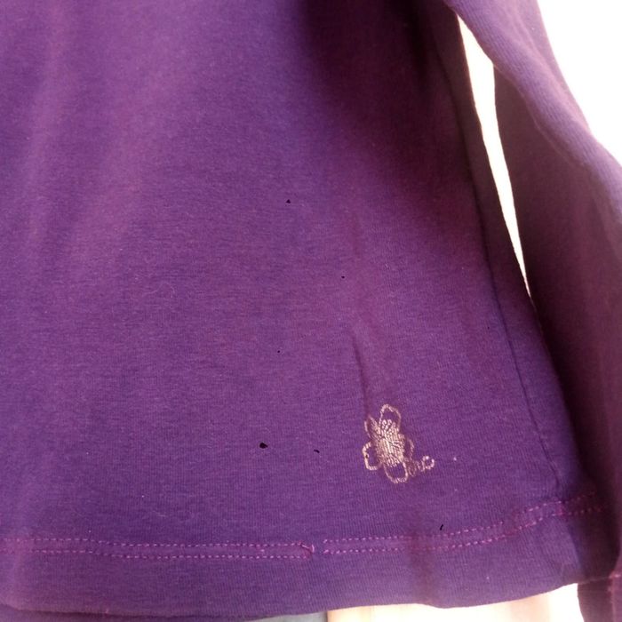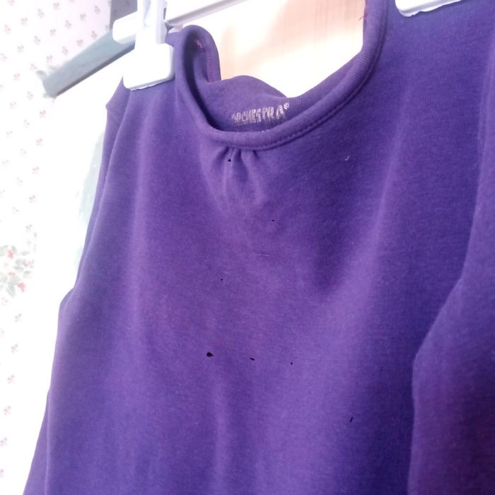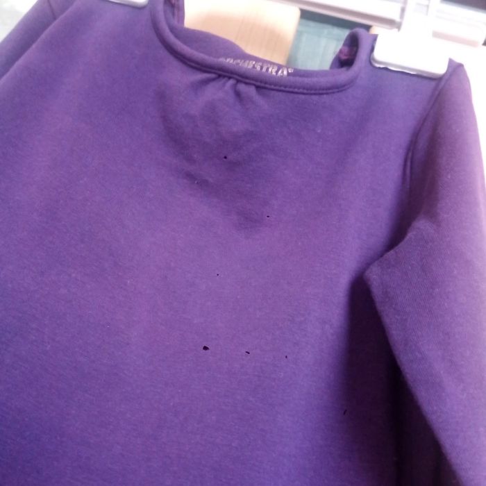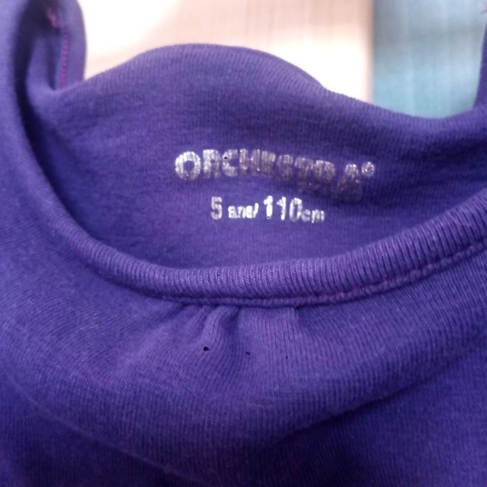 T-shirt taille 5 ans, violet foncé Orchestra Très bon état, pas usé, à part qu'il est un peu décousu devant et derrière (cf 2 dernières photos) mais peut être porté comme ça sans soucis car non visible. (Tâches noires = défaut du capteur photo)