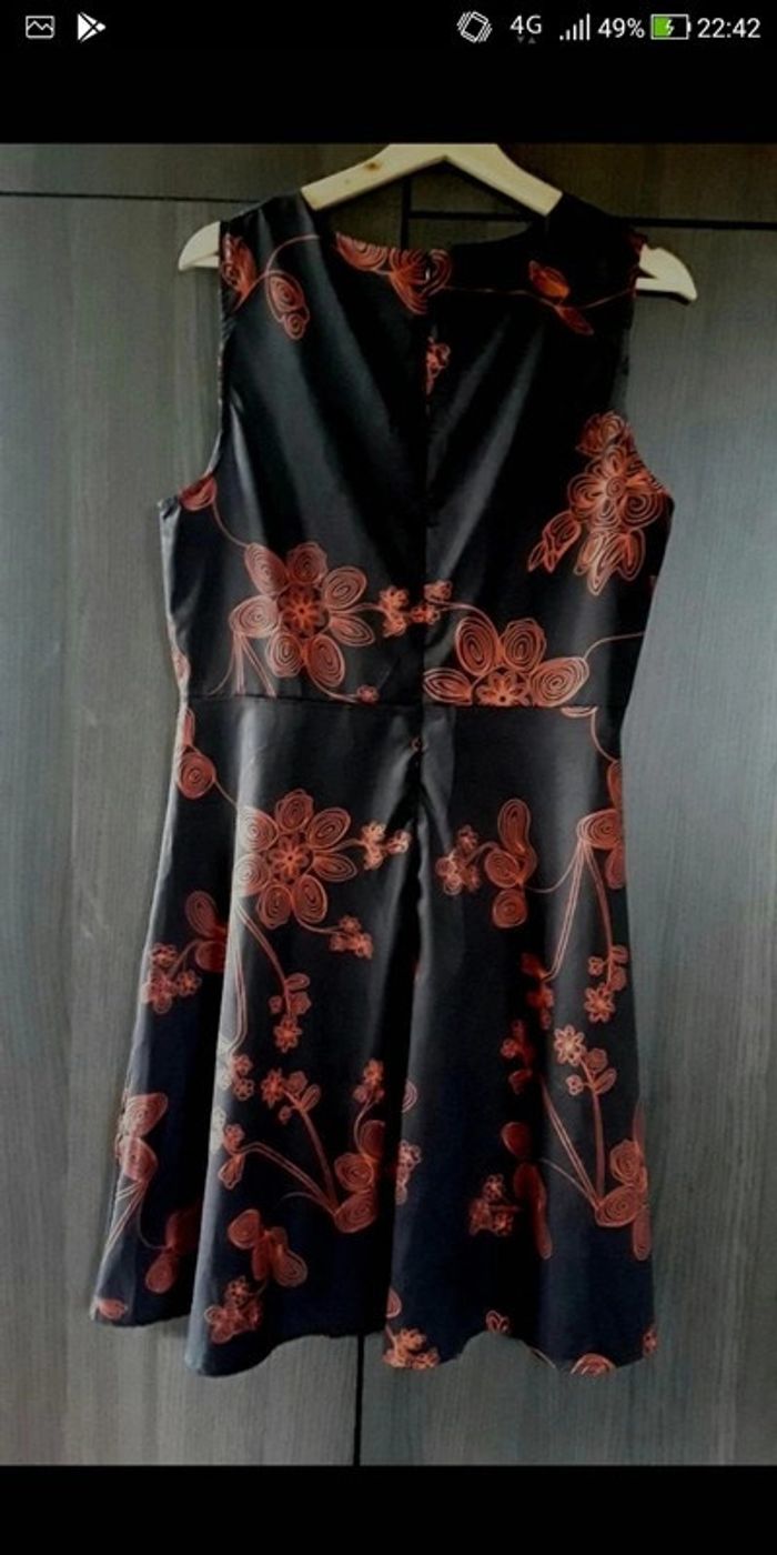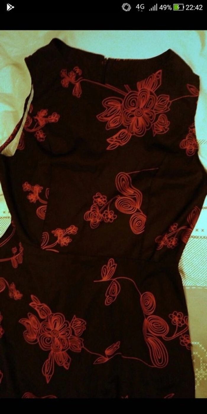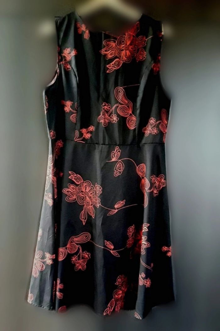 Robe noire légèrement satinée Motifs fleurs rouges taille 44, voir dimensions plus bas non portée. Fine et fluide, matière polyester Fermeture éclair à l'arrière Dimensions à plat : Poitrine 102 cm taille 90 cm Longueur 97 cm