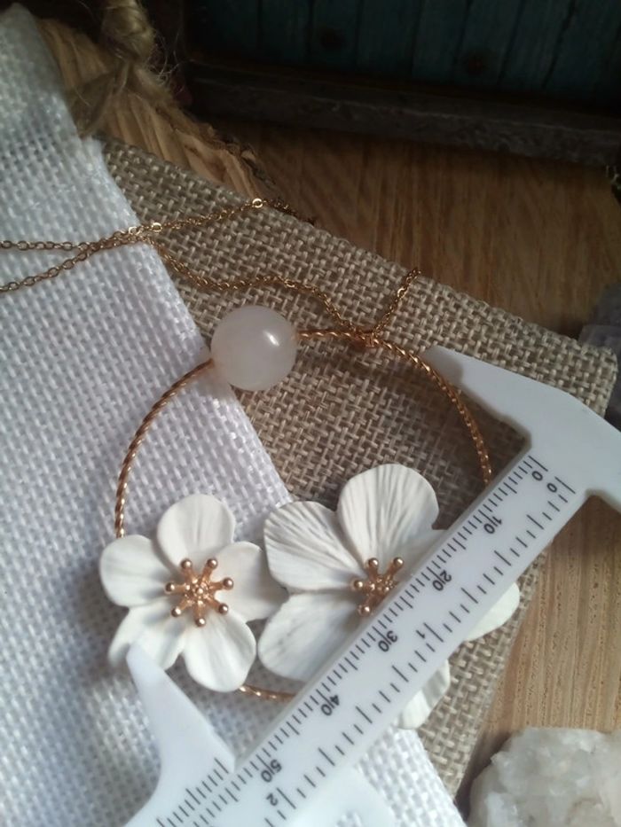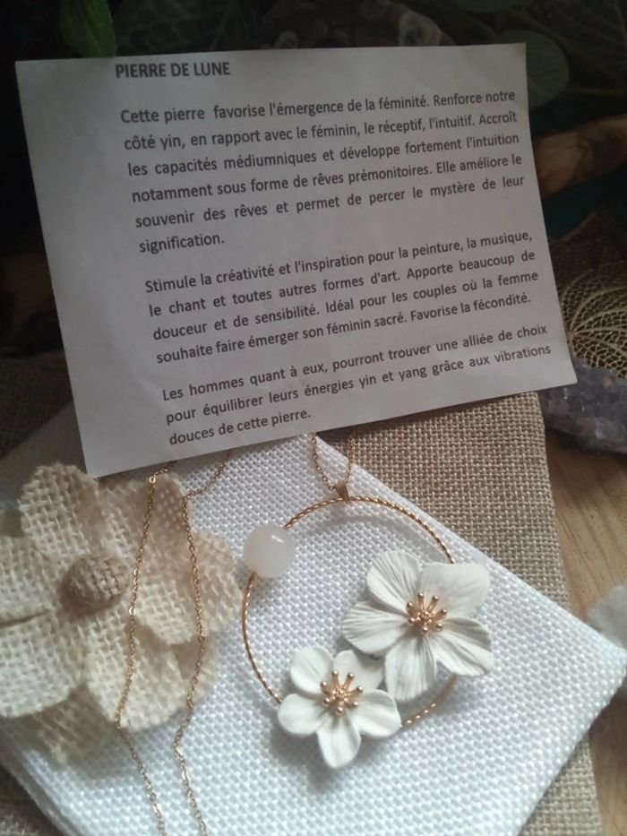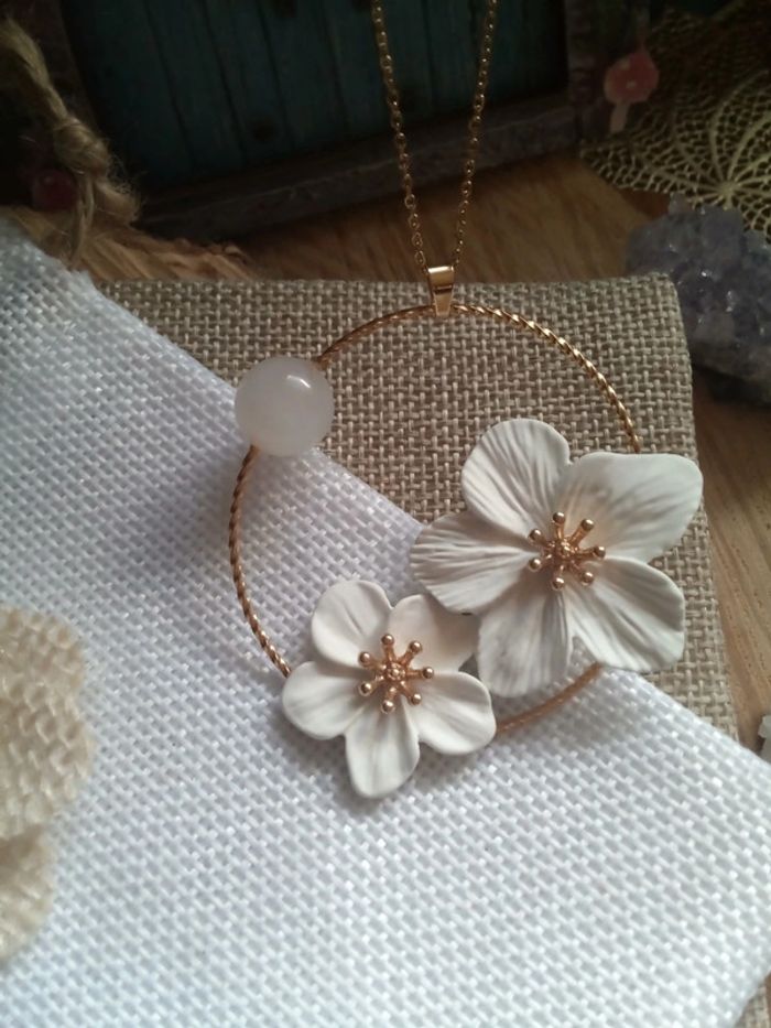 Collier anneau bohème fleurs blanches et pierre de lune - photo numéro 1