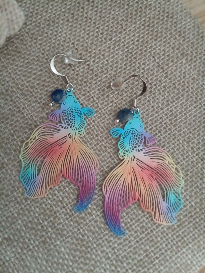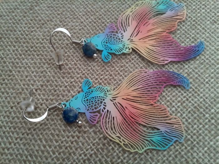 Boucles d'oreilles poissons filigranés et pierres de lapis lazuli - photo numéro 1