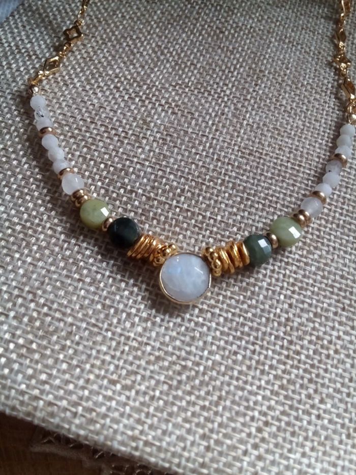 Collier en pierres semi précieuses, pierres de lune et de jade verte