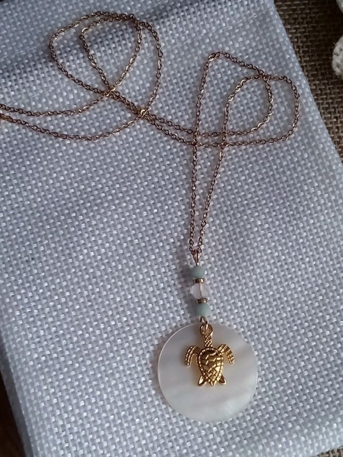 Collier n'a'c'r'e naturelle pierre de lune et d'amazonite+ tortue dorée - photo numéro 1