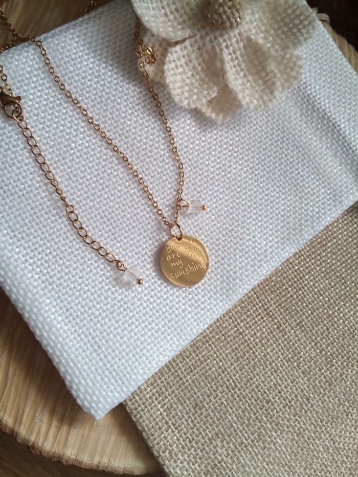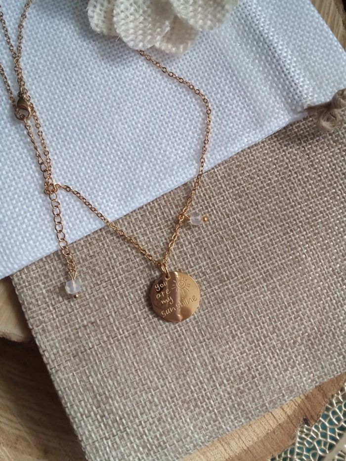 Collier médaillon "tu es mon soleil" et pierres de lune à reflets bleutés
