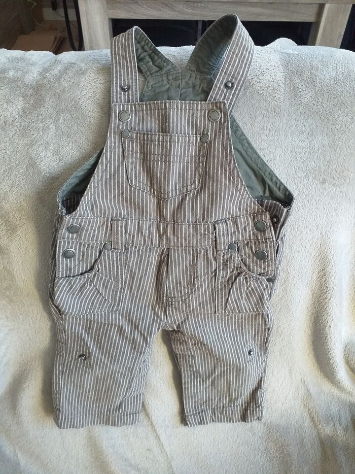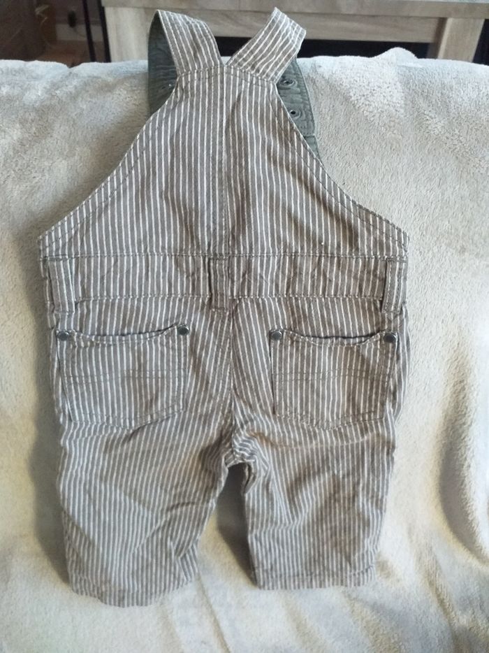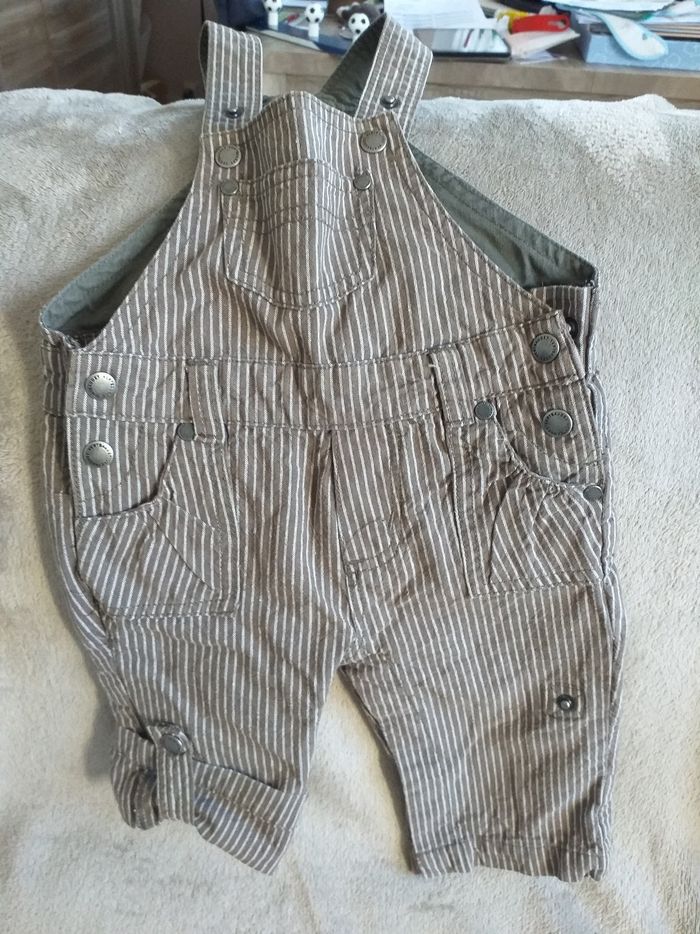 Salopette à rayures de couleur taupe. Possibilité de raccourcir le pantalon pour en faire comme un short. Toutes les fermetures sont à boutons pression. Taille: 6 mois ou 67cm. La couleur est plutôt taupe que marron