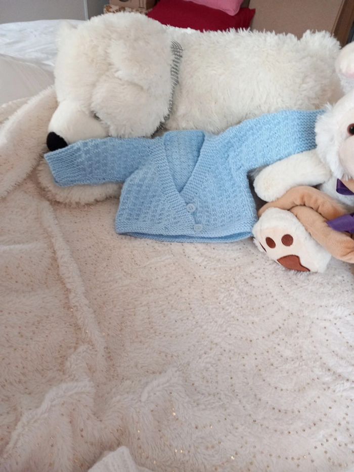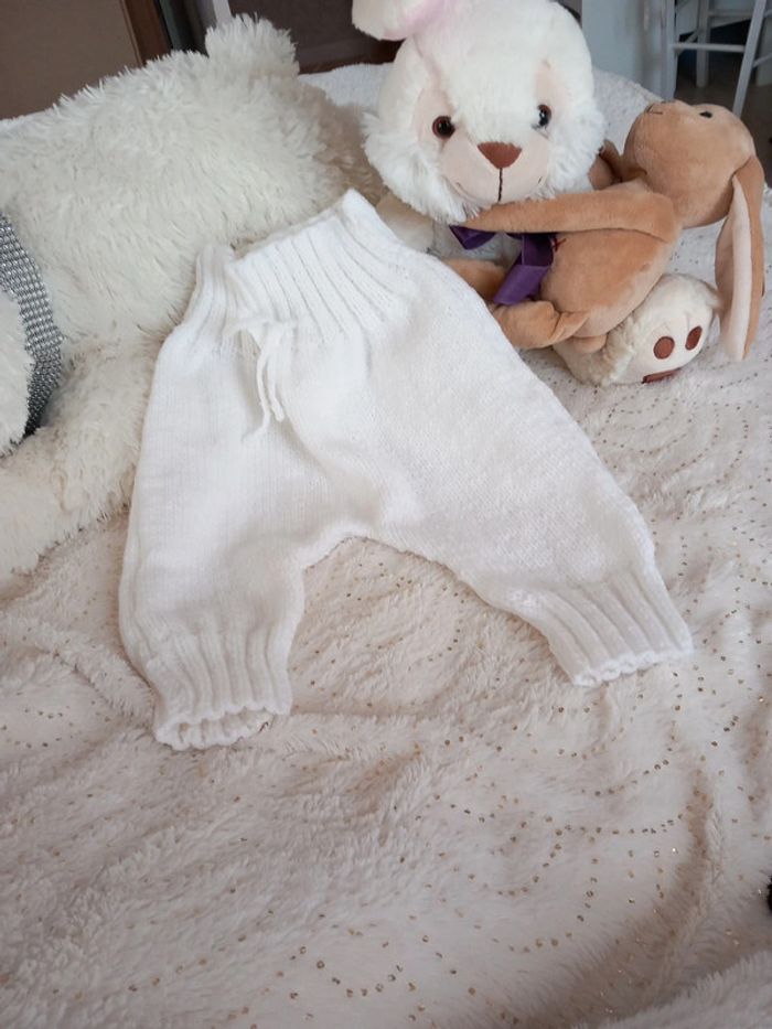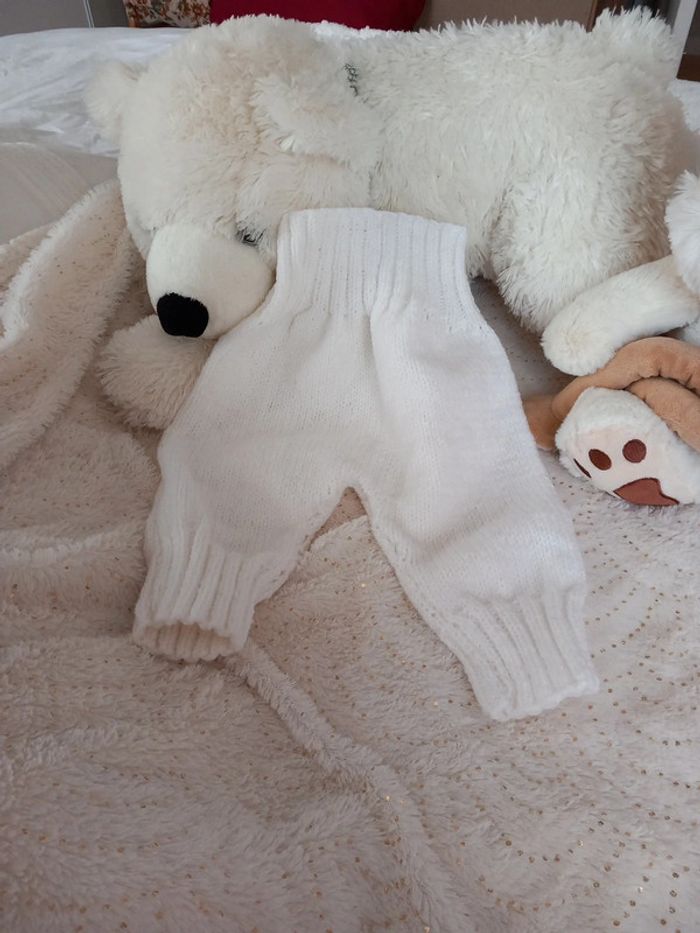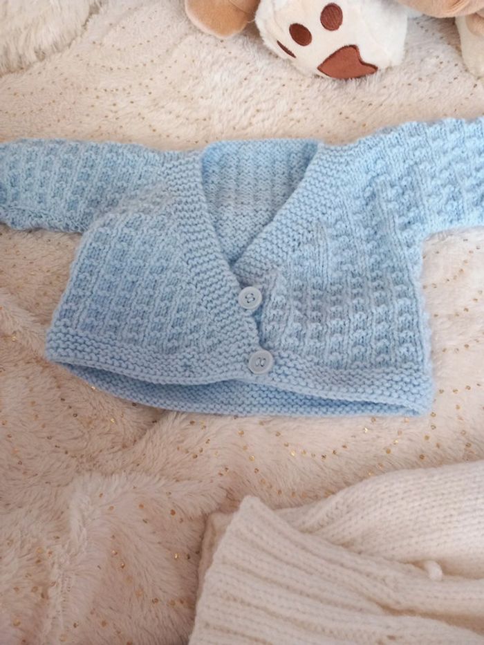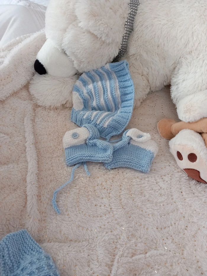 Ensemble layette prématuré 0/3 mois. Fait à la main. Il se compose d'un pantalon très chaud, d'un cache coeur d'une paire de chaussons et d'un bonnet
