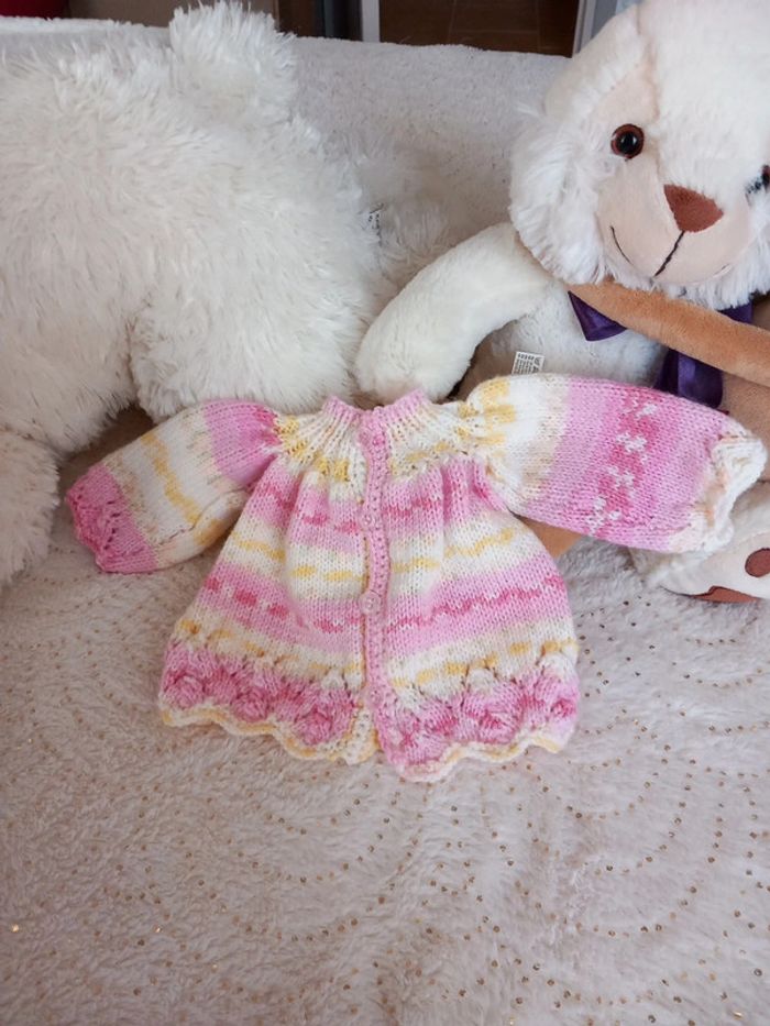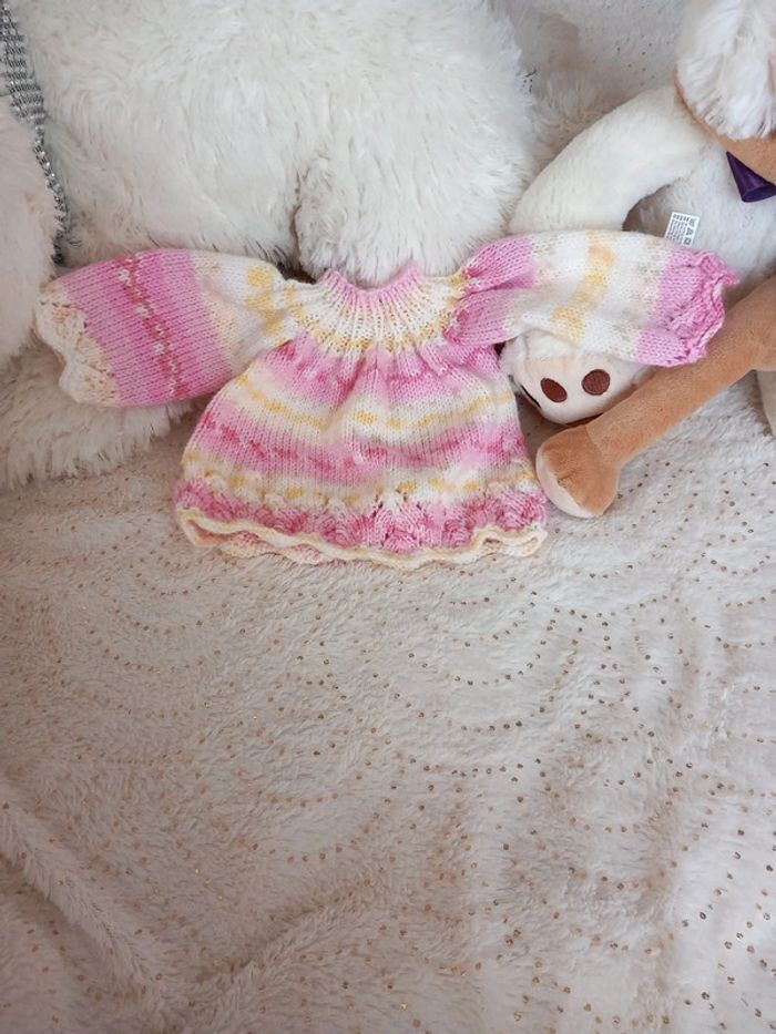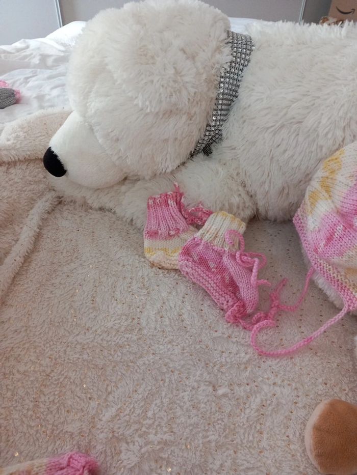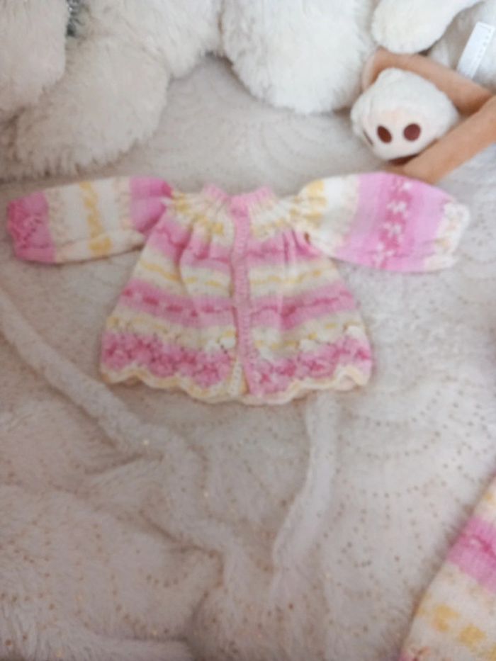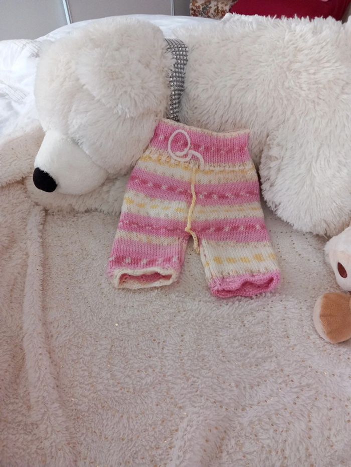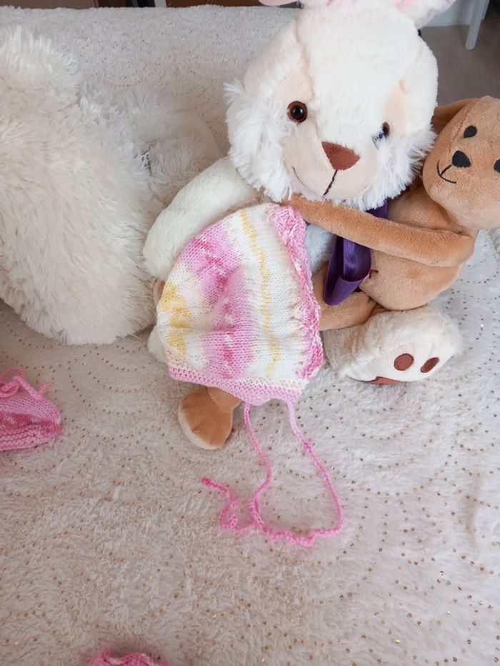 Ensemble layette prématuré composé un pantalon, d'une brassière. Deux petits chaussons et un bonnet Entièrement tricoté à la main. Taille prématuré/naissance