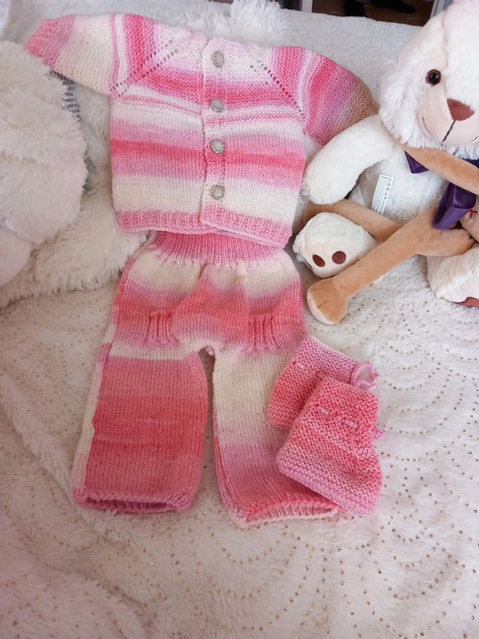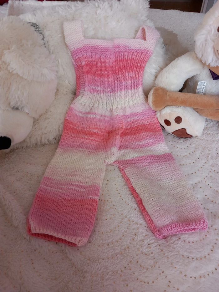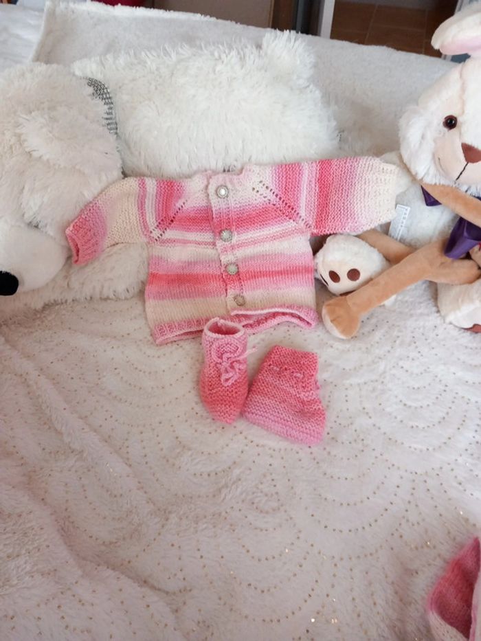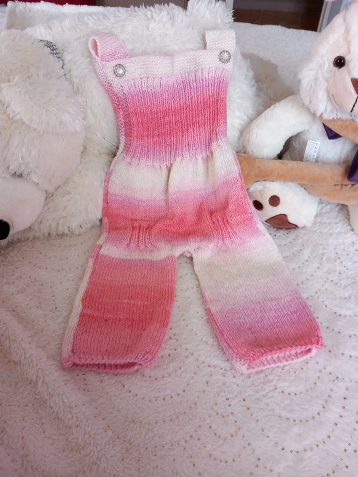 Ensemble layette composé d'une salopette, un petit gilet et deux chaussons entièrement tricoté à la main. Convient pour un bébé prématuré