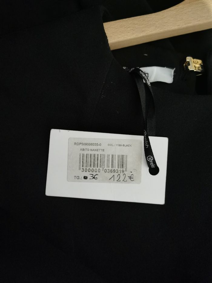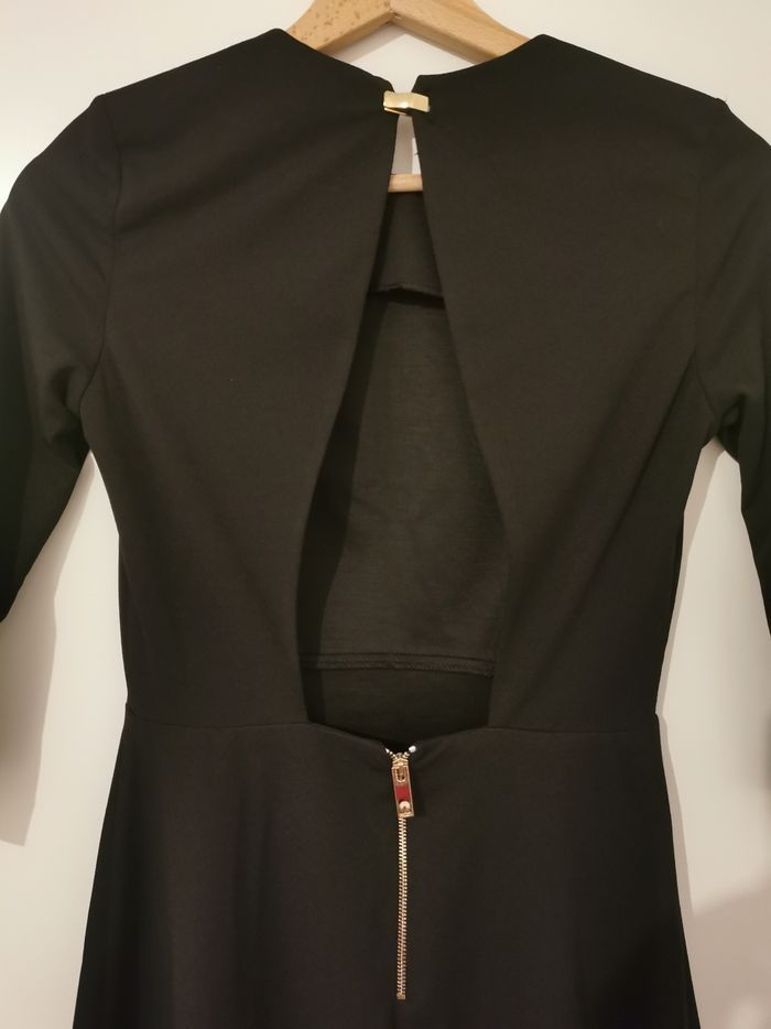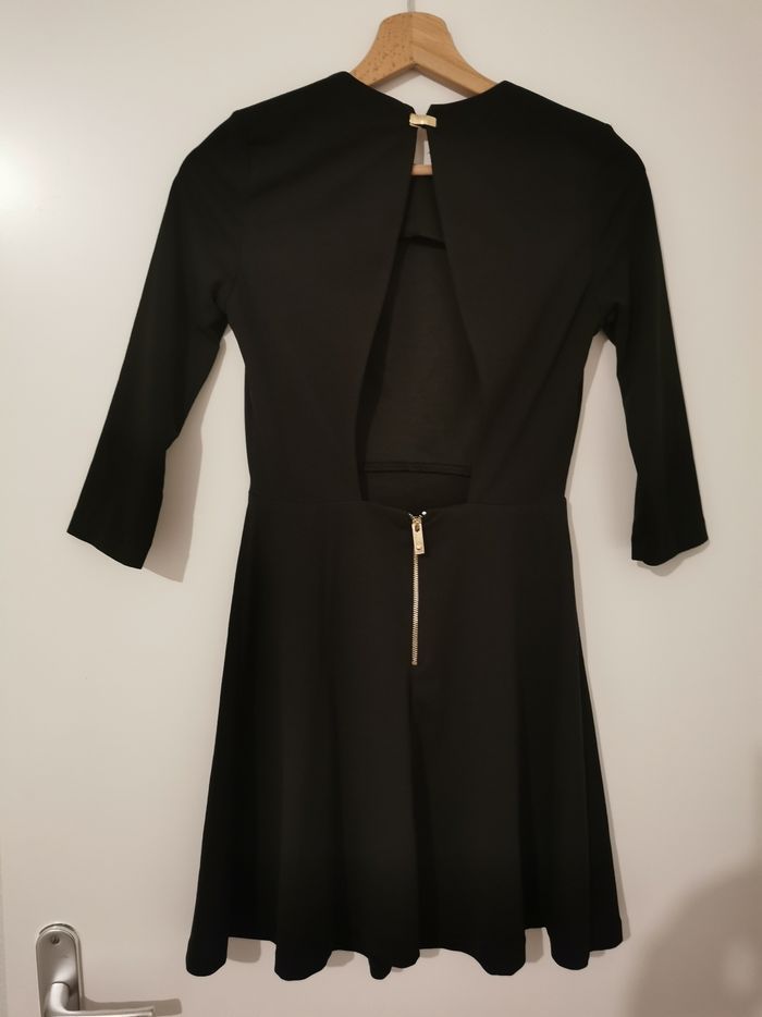 Composition : 93 % polyester, 7 % élastanne Couleur : noir Taille : 36 Col rond Manches 3/4 Dos nu Fermeture éclair et fermeture à boucle au dos Longueur de la robe : 85 cm Valeur en boutique : 122 € (voir photo)