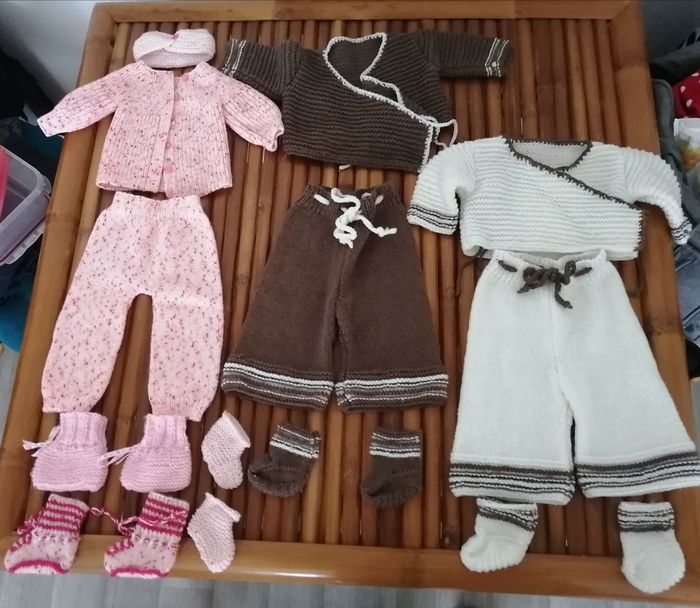 Ensembles fait mains un rose, un marron, un crème, Chaque ensemble à sa paire de chaussettes qui va avec