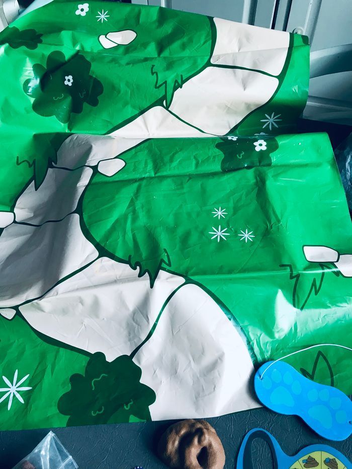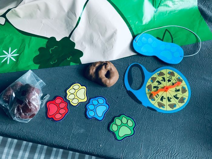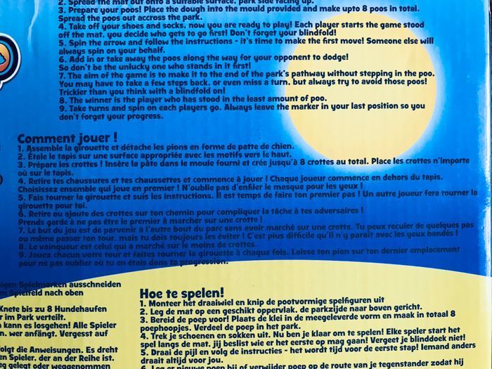 Jeux très rigolo ou il faut éviter d’écraser les crottes de chien en pâte à modeler, les yeux cachés. Tapis circuit en plastique lavable. Moule pour former les crottes. Ce joue sans problème dès 3 ans. En excellent état.