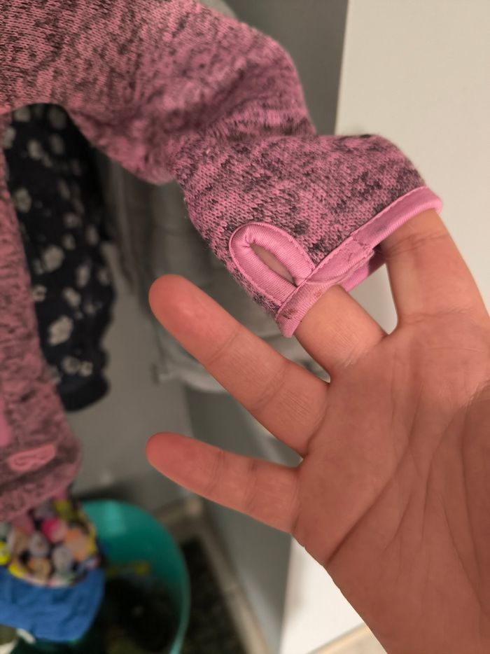 Veste polaire a capuche (qui s'enlève avec un zip). Trous pour passer les pouces pour pas que les manches remontent En très bon état