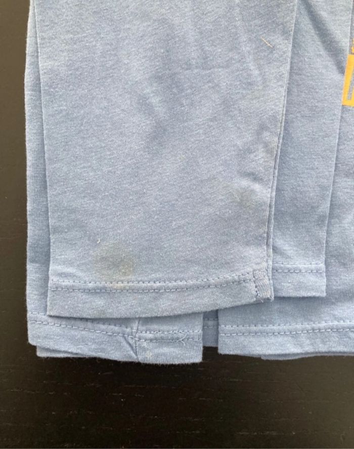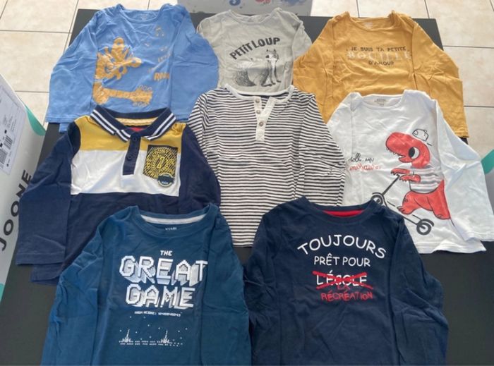 Lot de 9 tee-shirts en 36 mois (3 ans) de chez Kiabi principalement. 6 sont en très bon état, pas de défauts. 3 présentent des imperfections. Le gris a une tâche dans le dos, discrète. La marinière a des tâches sur le coude, visibles. Le bleu clair a des tâches et un bouton en moins (je le donne avec le lot). Voir photos. Eco conception.