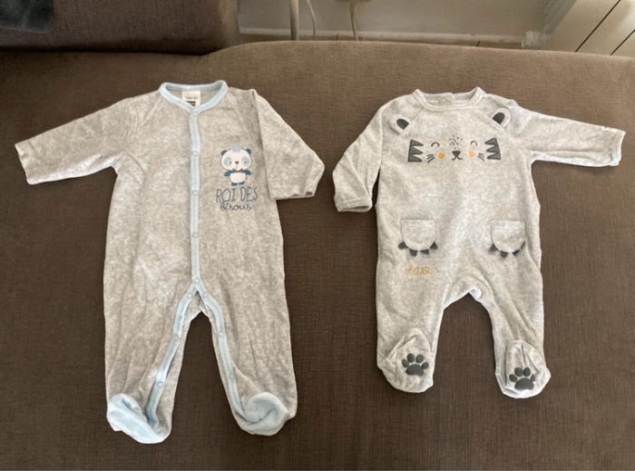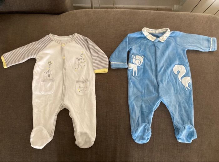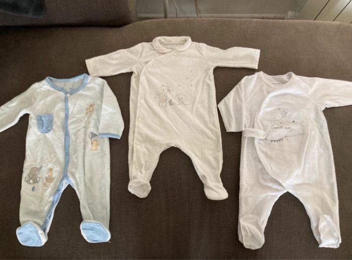 Lot de 8 pyjamas en 3 mois, toutes marques, principalement sergent major. Ils sont tous en velours sauf le dernier, il est en jersey. Ils ont presque tous une décoloration au niveau du col mais restent en bon état. Voir photos.