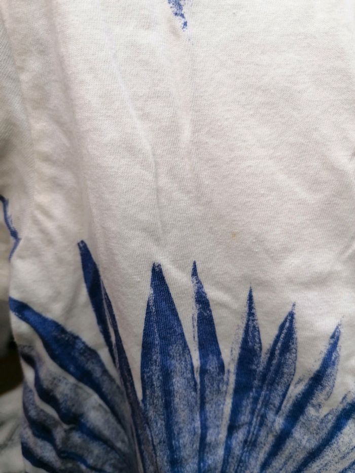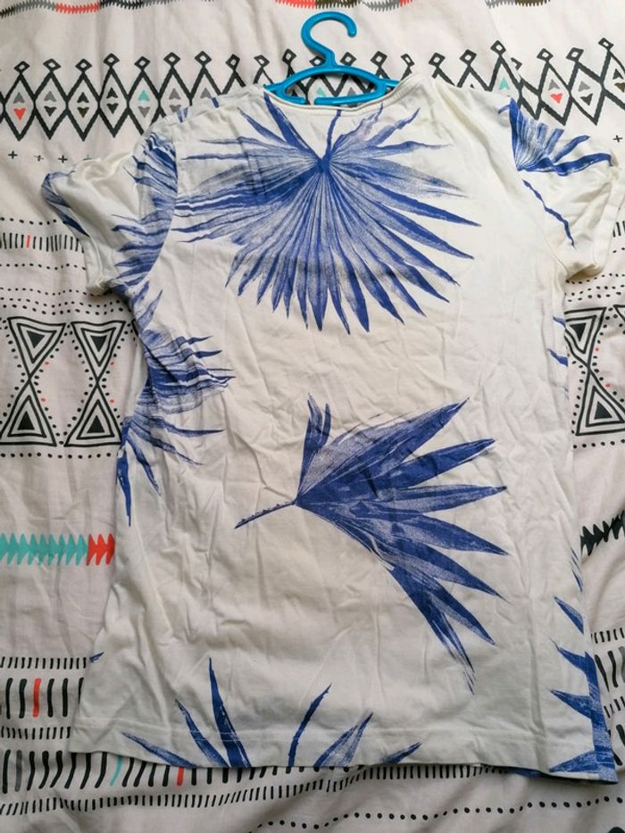 T-shirt homme DEVRED taille S. Motif palme bleu indigo sur fond blanc (une petite tache devant niveau poitrine, voir photo 3) Forme plutôt cintrée. A vendre car devenu trop petit. #po1yn_homme