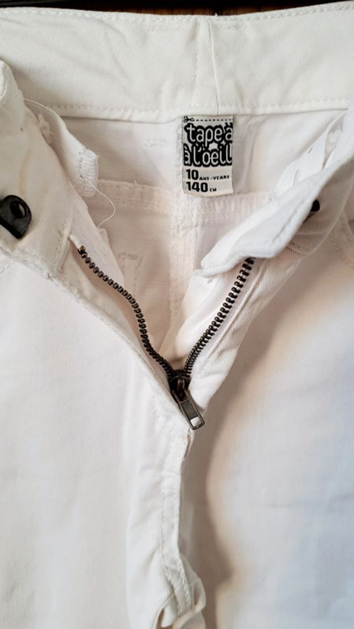 pantalon blanc de chez tape à l œil, taille 10ans article à peine porté, état impeccable ceinture réglable aucune tâche je reste à votre disposition pour toute information complémentaire 🙂
