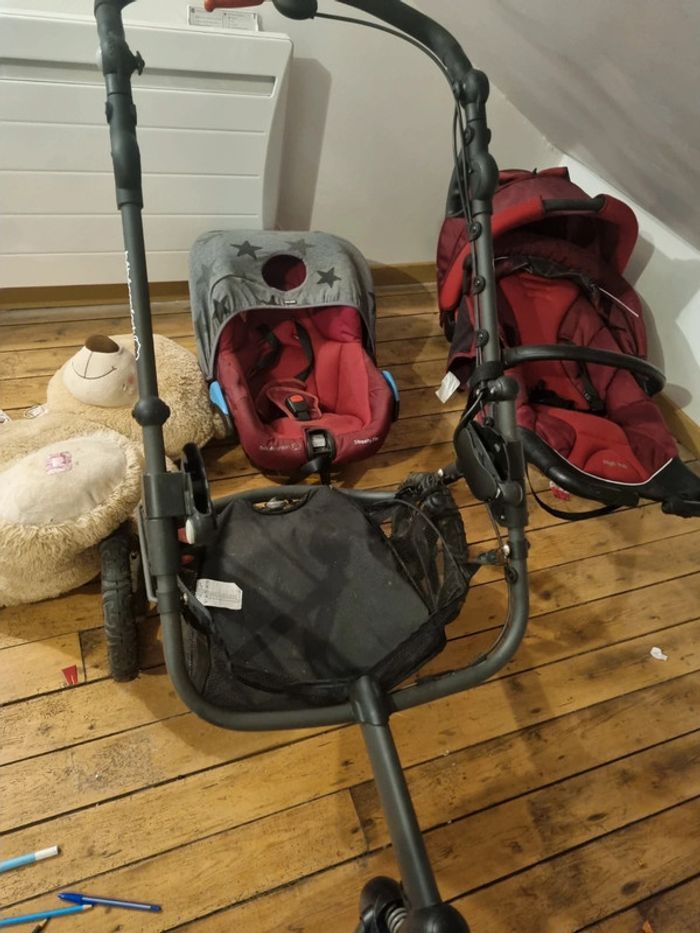 Vend poussette avec maxi-cosy, landau et poussette classique. Se plis très facilement à l'aide des 2 poignées. Les 3 roues pneumatiques peuvent se retirer pour faciliter le rangement dans le coffre. Tout en très bon état, à servie pour mes deux enfants. Un peu usée sur le métal à l'arrière au niveau des pieds, voir photo. N'hésitez pas pour plus de photos ou renseignements. Remise uniquement en main propre à mon domicile.