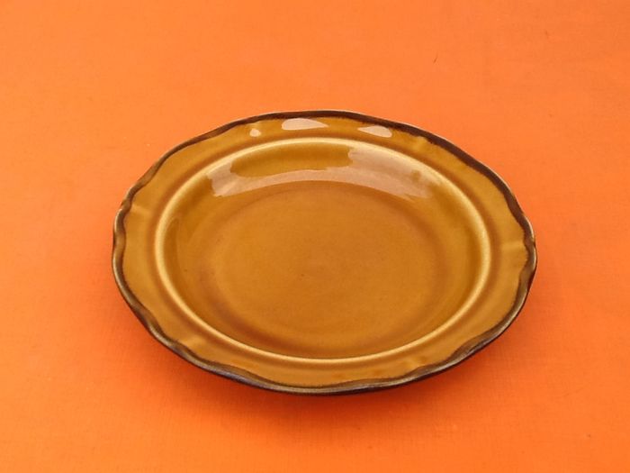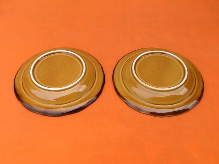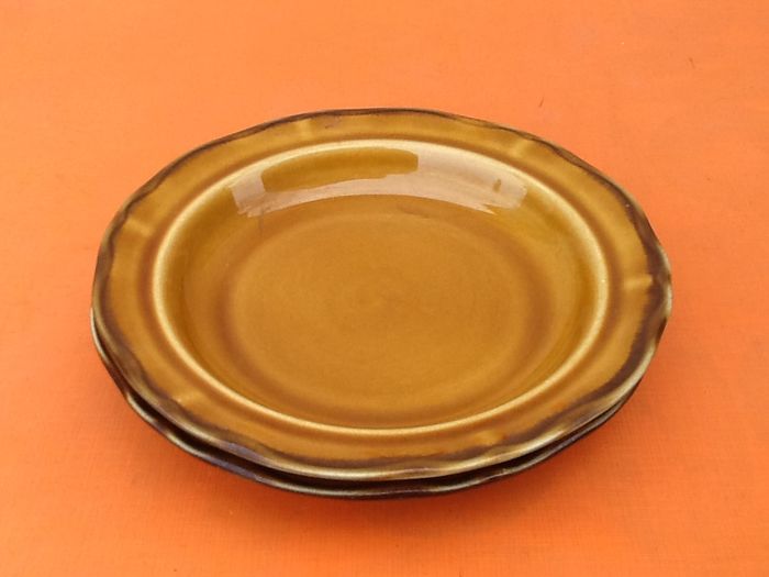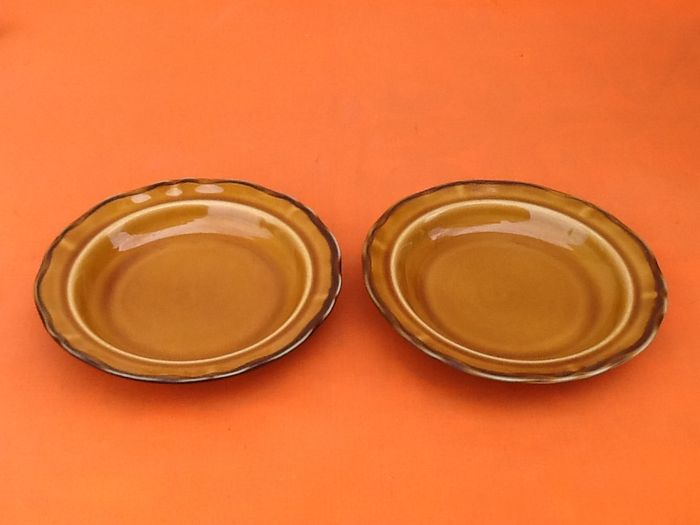 (article vendu en l' état, état d' usage voir toutes les photos) 2 assiettes creuses polylobes Dans le style faïence de Haute-de-Provence Couleur ocre bandeau marron Diamètre : 21cm Hauteur : 3,5cm