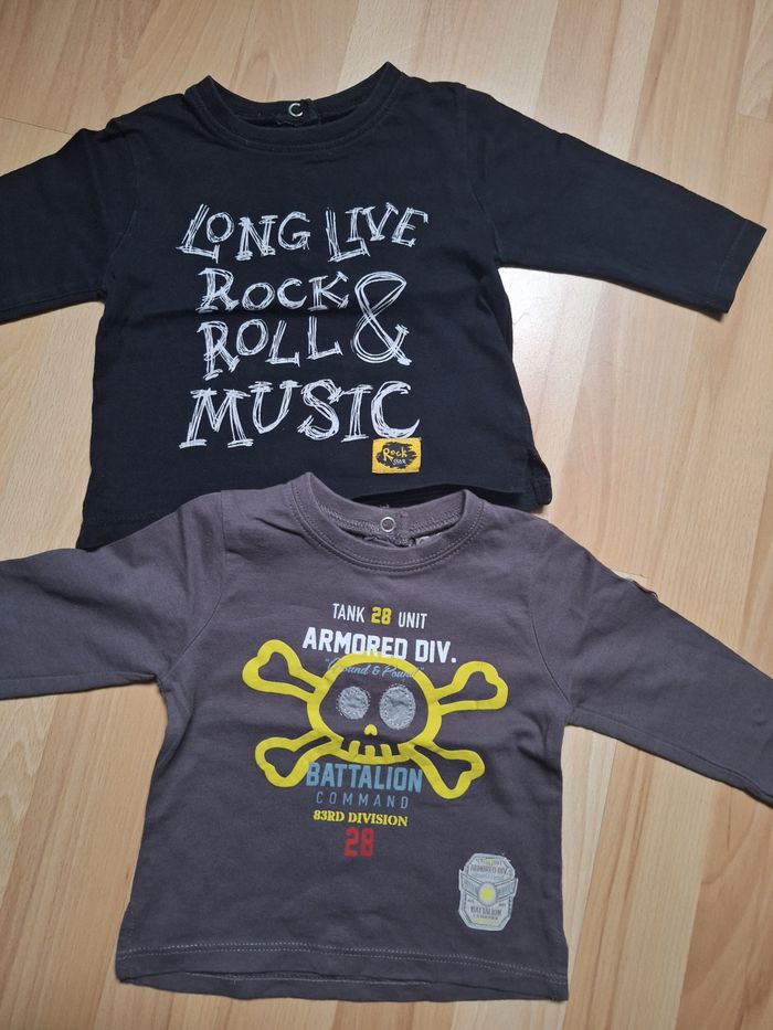 GARÇON 6 MOIS N°711 lot de 4 maillot ml - bleu marine, - gris , imprimé - noir , imprimé - noir , imprimé 100% coton Pression au dos Taille 6 mois Pikouic 2€ #kelly_garçon6mois