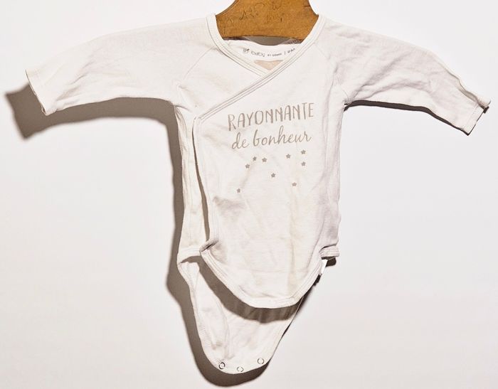 Bonjour. Vend bodie enfant 9 mois blanc avec inscription "rayonnante de bonheur" qui s'ouvre entièrement à l'aide de pressions.
