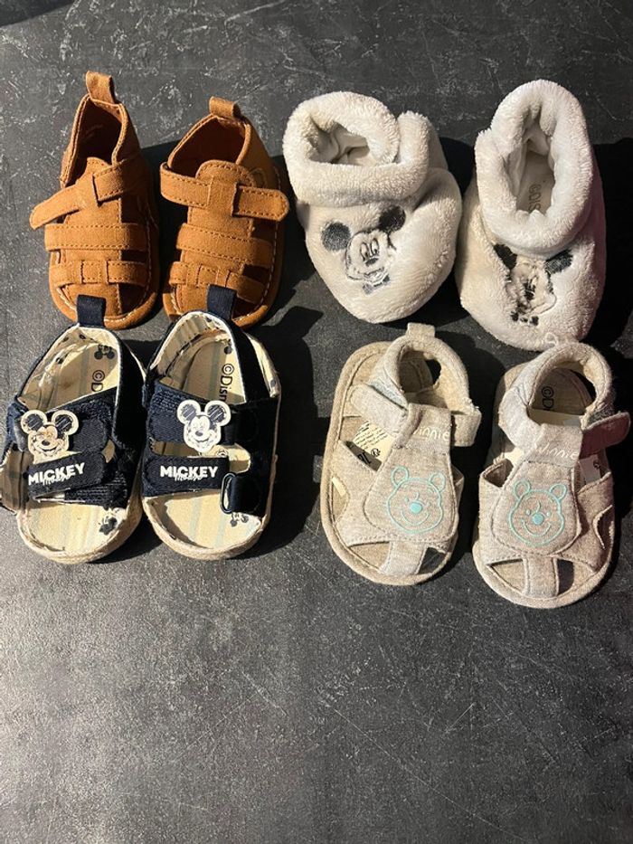 En excellent état - chaussures Marron 0-3 mois ( petite écriture dessous la chaussure) - chausson Mickey 0-6 mois - chaussures ouvertes Mickey 6-9 mois - Chaussures Winnie 6-9 mois